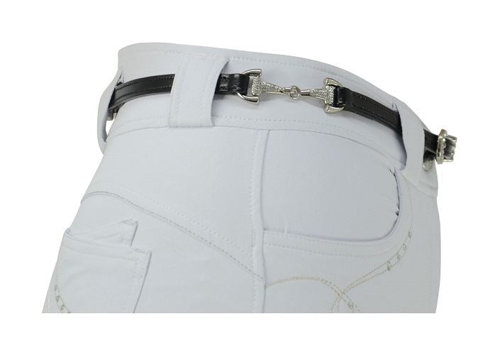This is A stunning leather belt featuring three snaffle bits with intricate crystal detailing. Perfect to match with competition breeches, or to add some sparkle to a casual outfit.