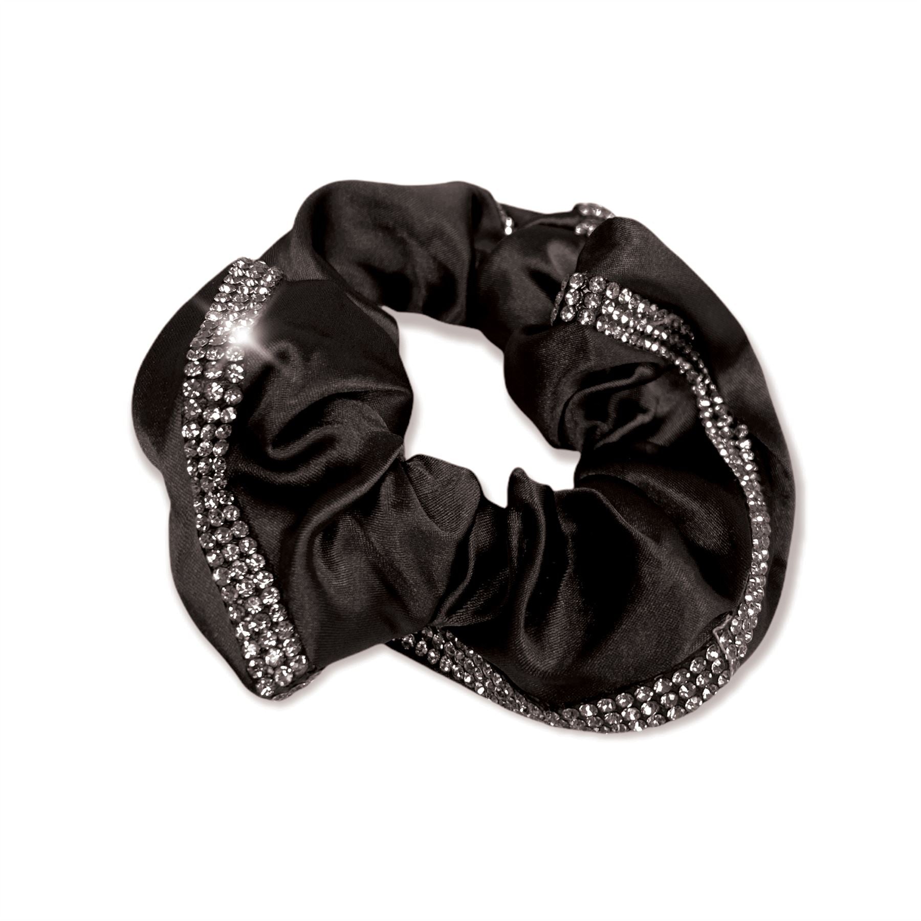 Beautiful plush satin hair scrunchie with beautiful crystal�embellished. Perfect for dressage and equestrian events.�Elasticated one size fits all. 100% polyester + trims