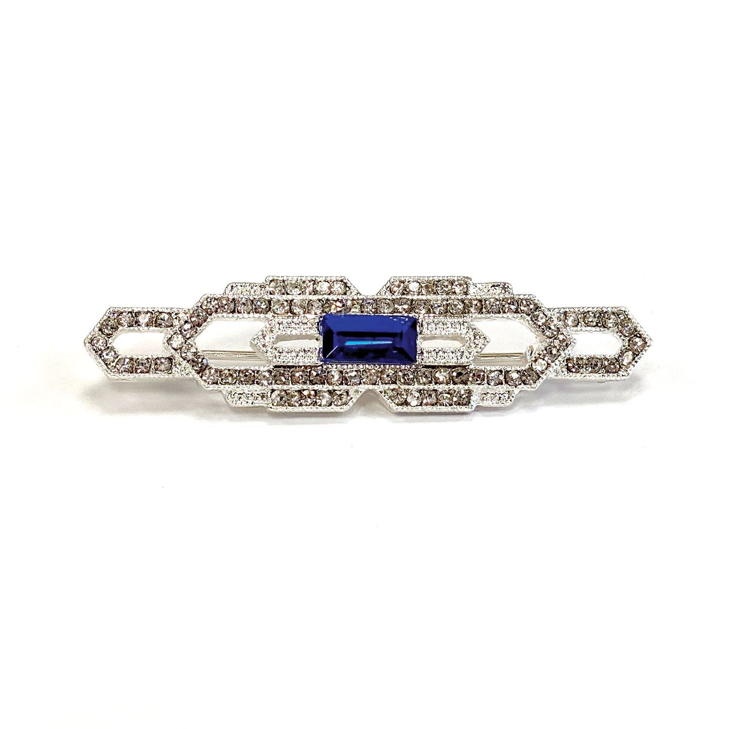 Beautiful Art Deco design pin with stunning emerald cut faux sapphire to centre with subtle crystal surround. Safety clasp to back. nickel free / CZ