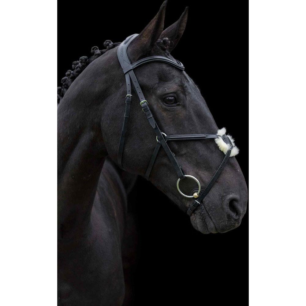With a raised and padded dipped browband, soft sheepskin grackle noseband and a clever chin strap to keep the whole piece balanced.