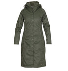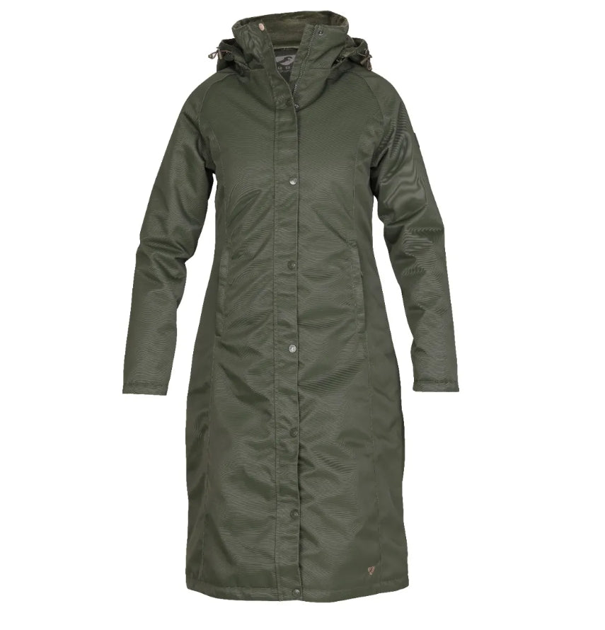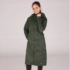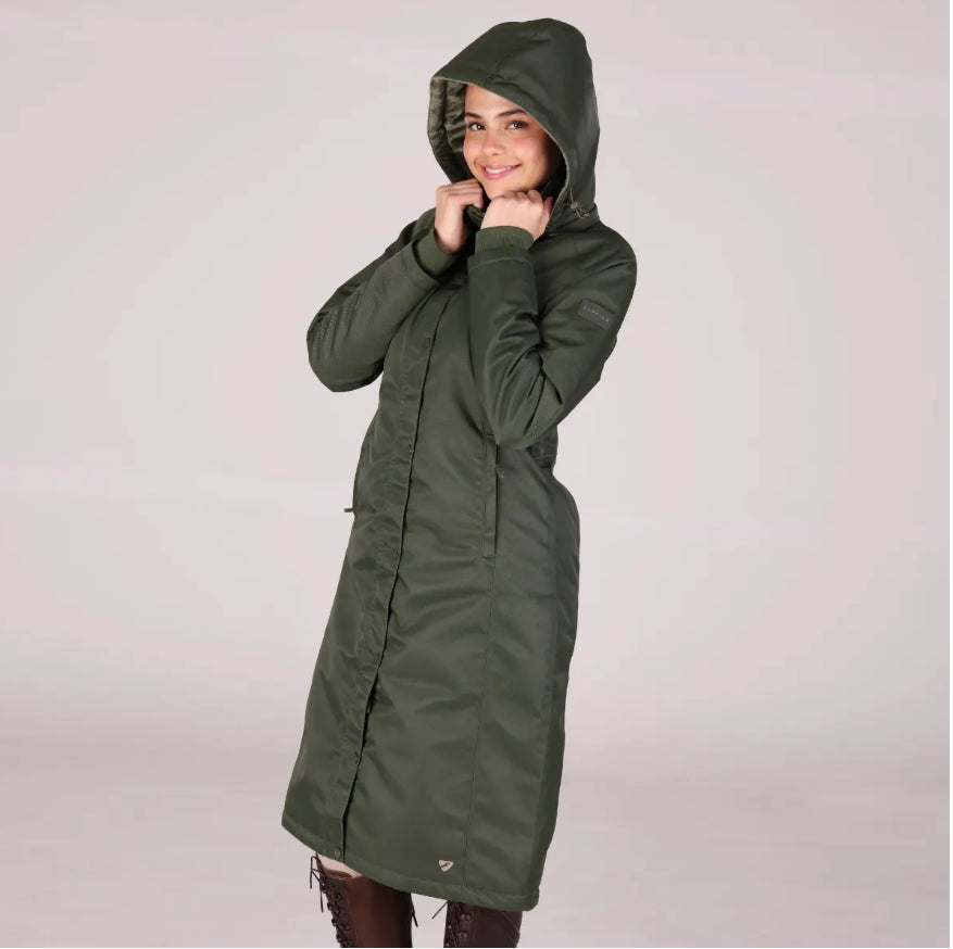 Indispensable for the winter rider, the Halcyon coat offers flexible wear options via the hidden rear zip which allows the lower back to be split for horse riding or walking comfort. The mid-thigh length coat is practical through the seasons a durable outer is waterproof and breathable, quilted lining is faced with luxe faux fur to the body, neck and inner hood for snug warmth. Further detail: mid thigh length, roomy fit for winter layers, rear riding vent, zip off hood with elastic bungees, two way front zip, chin guard, zip pullers, two outer and one inner chest zip pockets, stretch wrist cuffs, subtle embossed leopard print lining, Aubrion embroidery and prints. Outer fabric waterproof rating: 5000mm with breathability rating 5000g/m2/24h. DWR (durable water repellent) finish causes moisture to shed, bead up and roll off the outer surface of the garment to help maintain breathability.