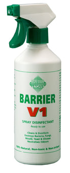 Shop now at Just Horse Riders for the Barrier V1 Spray Disinfectant - a ready-to-use, safe, and pleasantly scented solution designed to both clean and disinfect simultaneously. This powerful spray annihilates fungi, mould, yeast, viruses, and all known bacteria, ensuring a hygienic environment for you and your horse. It's perfect for use on all hard surfaces and even in those hard-to-reach areas.