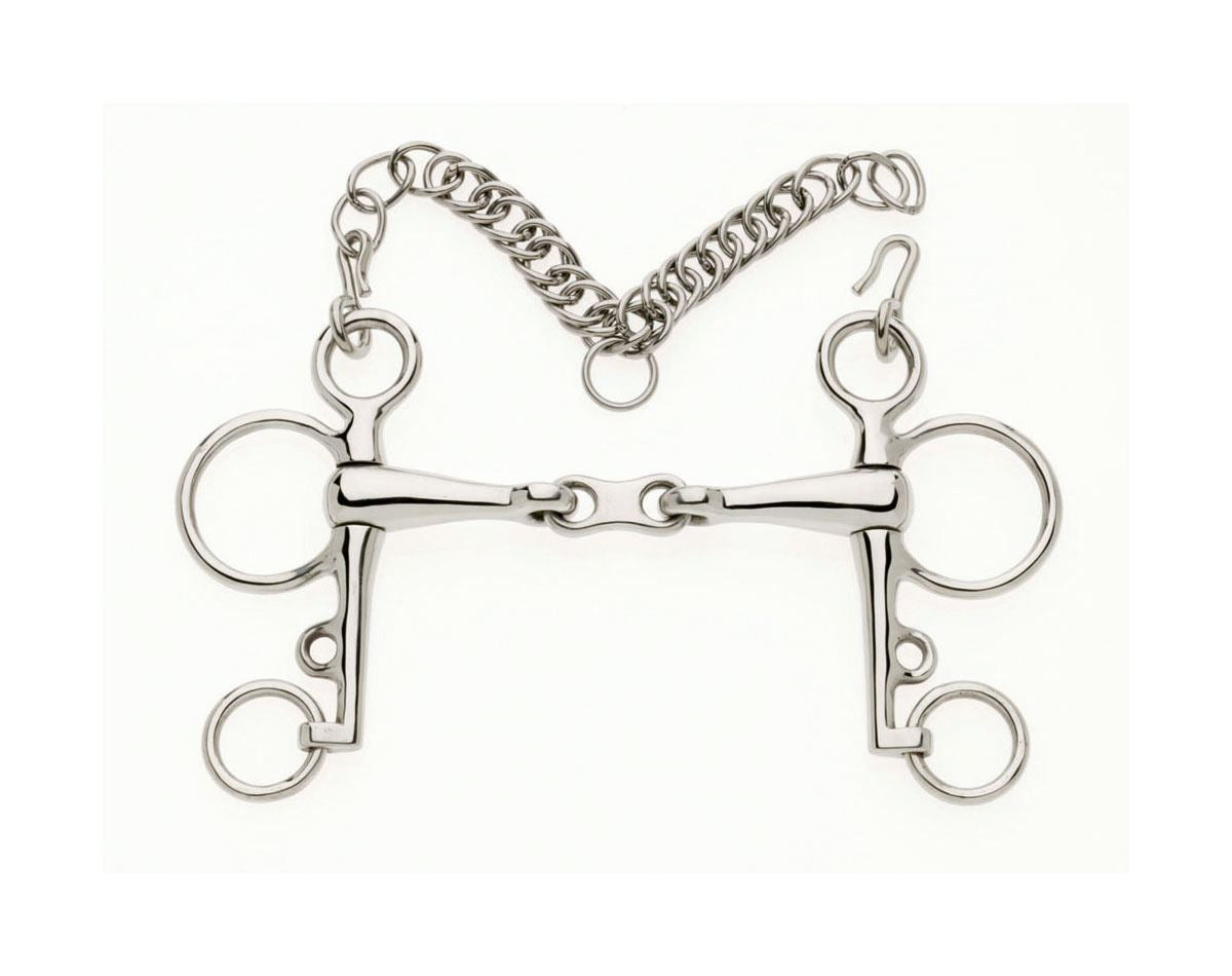 French link mouthpiece relives the nutcracker action and prevents palate pressure. Ideally used with two reins, but one rein can be used if roundings are used.