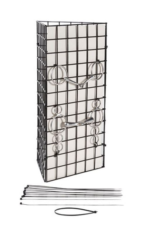 Highly effective for displaying horse bits and other smaller, hard to display products. Supplied with 24 cable ties - 6 for assembly and 18 for product attachment. Fabric or card (why not print it with brand name/prices?) can be placed inside the rack to create various effects. Good product security is achieved by the use of the cable ties. Fixing down of the rack is recommended if protruding or heavy products are to be displayed. Supplied flat, unassembled and without card. Steel mesh, Black stubbyfine coated.
