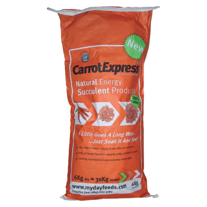 Air-dried carrot pieces. Just soak to use. Ready in 20 minutes. Contains no artificial colourings or flavourings. Tempts fussy feeders and is a great source of natural energy. 6kg size is equivalent to 30kg of raw carrot. Also ideal for alpacas or pets such as rabbits and guinea pigs.