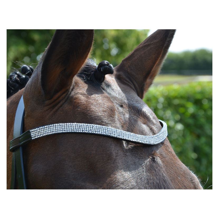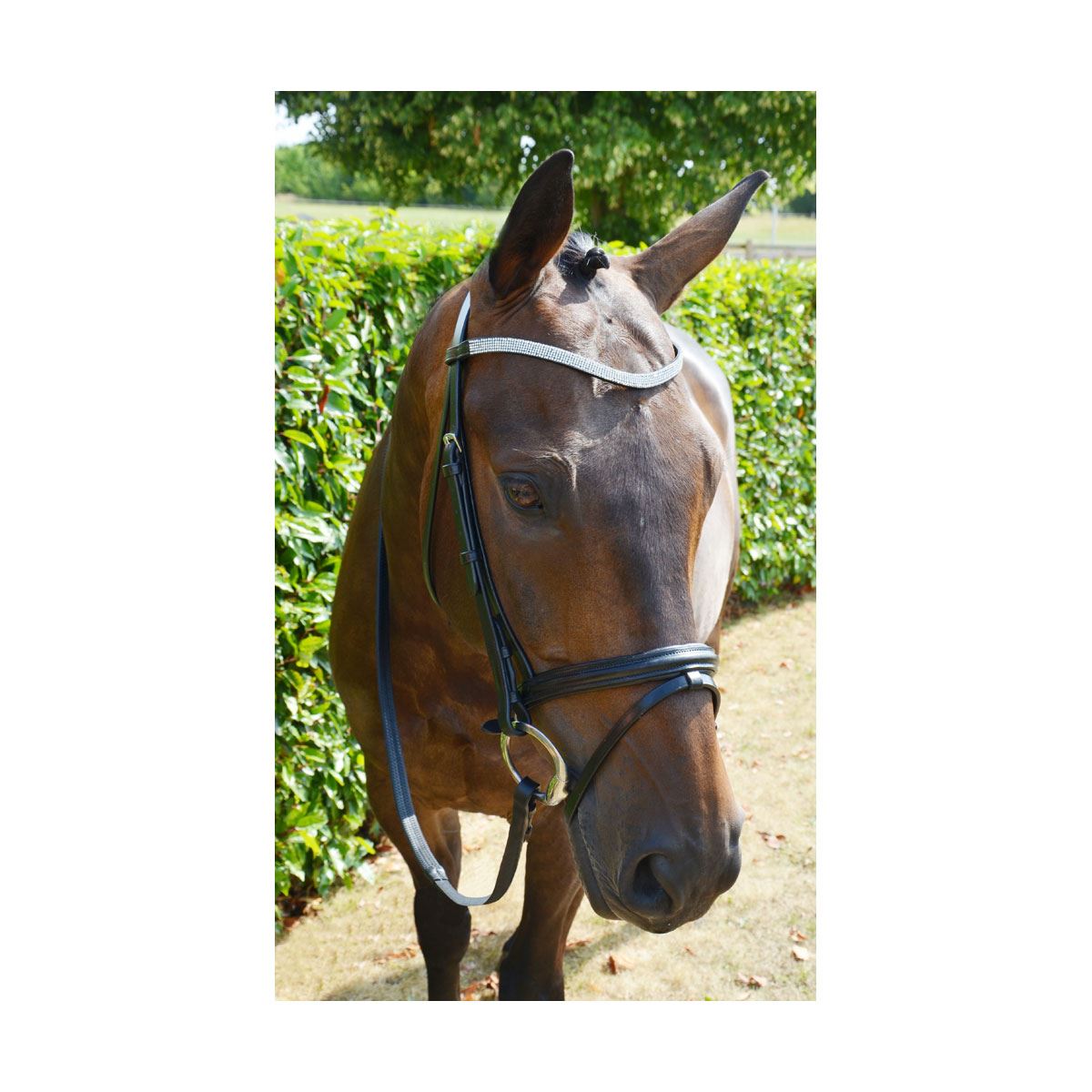 The Diamond Flash is a classic looking black leather bridle adorned with 5 delicate rows of subtle diamante bling on the brow band. Durable and supple, this traditional style bridle features a padded noseband with a detachable flash, stainless steel hardware and a standard headpiece and comes complete with a set of rubber grip reins.