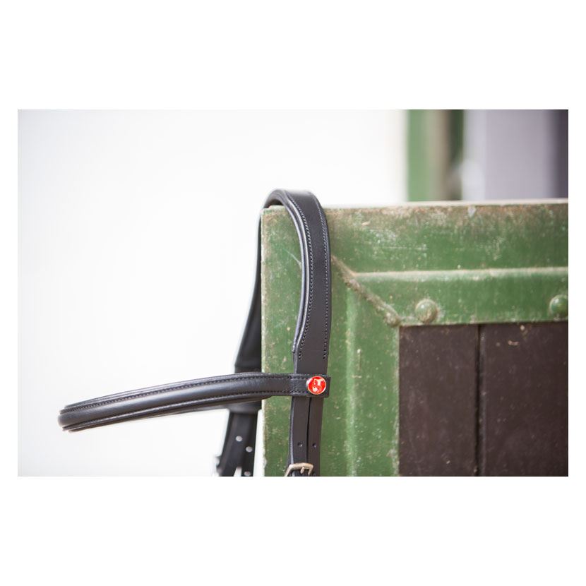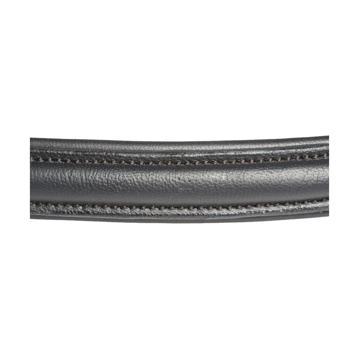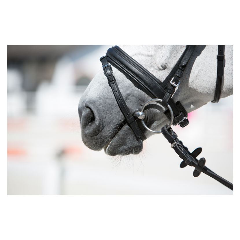 Made of extremely soft leather with a soft padded crownpiece. A 'Professional' cut-back design for more ear comfort with a curved browband (not lined) and grey crystals. The width of noseband for Cob and Full is 32mm. The noseband can be buckled on both sides with chrome buckles and web reins.