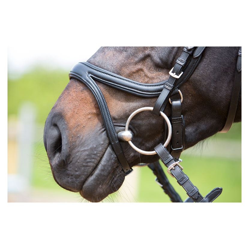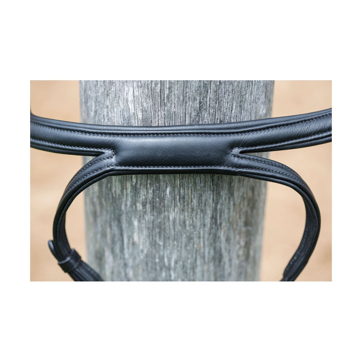 This snaffle bridle is another innovative addition to our Kieffer Ultrasoft Family. With the Tara the flash strap is integrated into the curved noseband. This helps to relieve pressure on the sensitive nasal bone and keeps the noseband in the correct position. The noseband curves up into the cheek piece, relieving the cheek bone and providing more space for the bit ring. Made of extremely soft leather with a soft padded anatomically shaped crownpiece. A cut-back design for more ear comfort and a fineline browband (not lined) with silver-coloured metal beads. The noseband can be buckled on both sides with chrome buckles and web reins.
