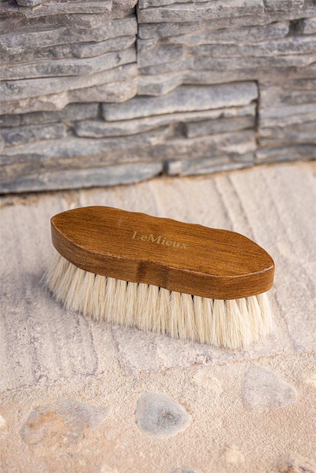 This anti-static bristle finishing brush is naturally soft to bring out your horse's ultimate shine. The ergonomic wooden handle features cleverly-placed grooves for a secure yet comfortable grip, giving you complete control on even the dirtiest grooms. Beautiful gold foil debossed branding adds a touch of sophisticated LeMieux style.