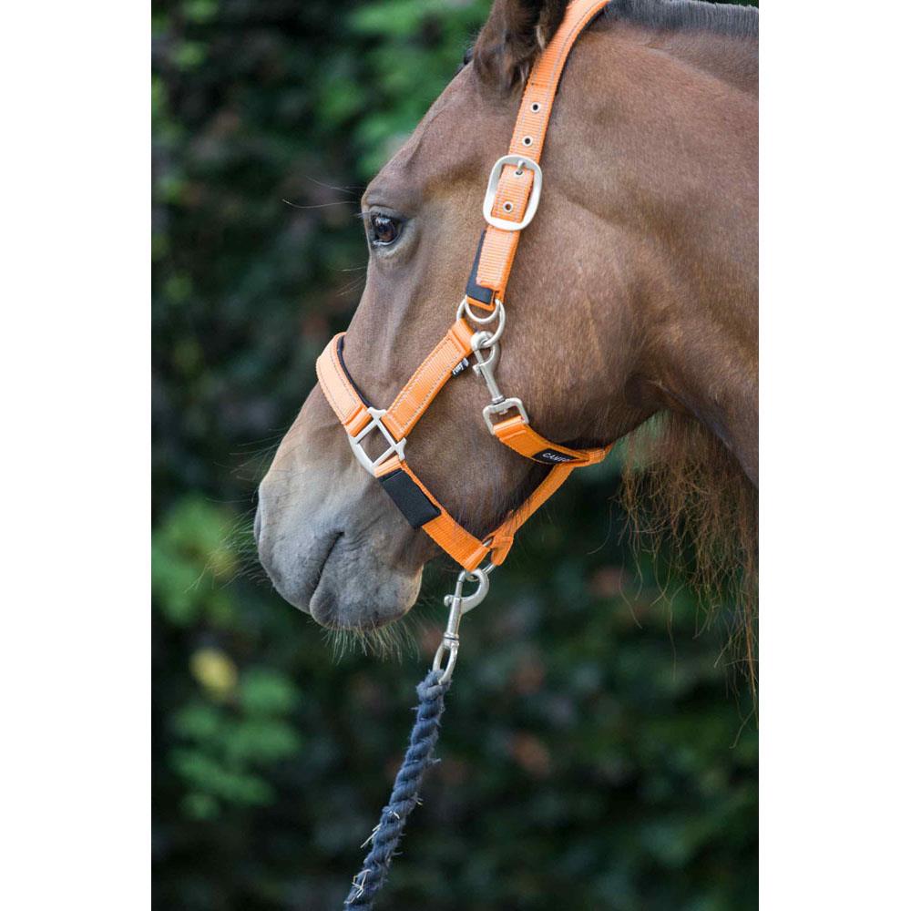 Made with a reflective tape with a breakpoint at the throatlash and nose. This clever design means it can be used as a normal headcollar or a fieldsafe. With soft neoprene padding on the nose and poll for extra comfort and strong durable fittings. The reflective tape makes it easier to find in a field, just shine the torch to help illuminate the product.