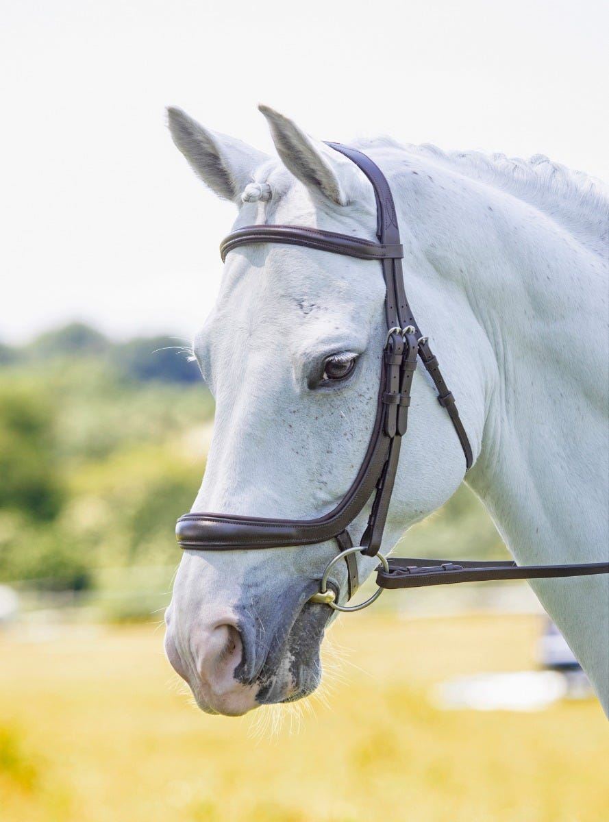 Sensitive horses respond well to the Velociti RAPIDA curved cavesson bridle which offers the horse a greater sense of freedom. The curved shape relieves compression at the cheekbones, jaw and sensitive nerve endings. The padded noseband gives a greater spread of pressure creating a less restricted feeling for the horse. Tech details: FreedomFit headpiece - designed to relieve pressure thanks to the wide, cushioned crown with poll gap and cutaway ear profile. Soft leather combined with generous, anti-shock padding on the headpiece, browband and noseband. Elegant profile due to sleek, angled throatlash. High shine stainless steel harness buckles. Signature Velociti RAPIDA reins for flexible and assured grip.