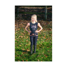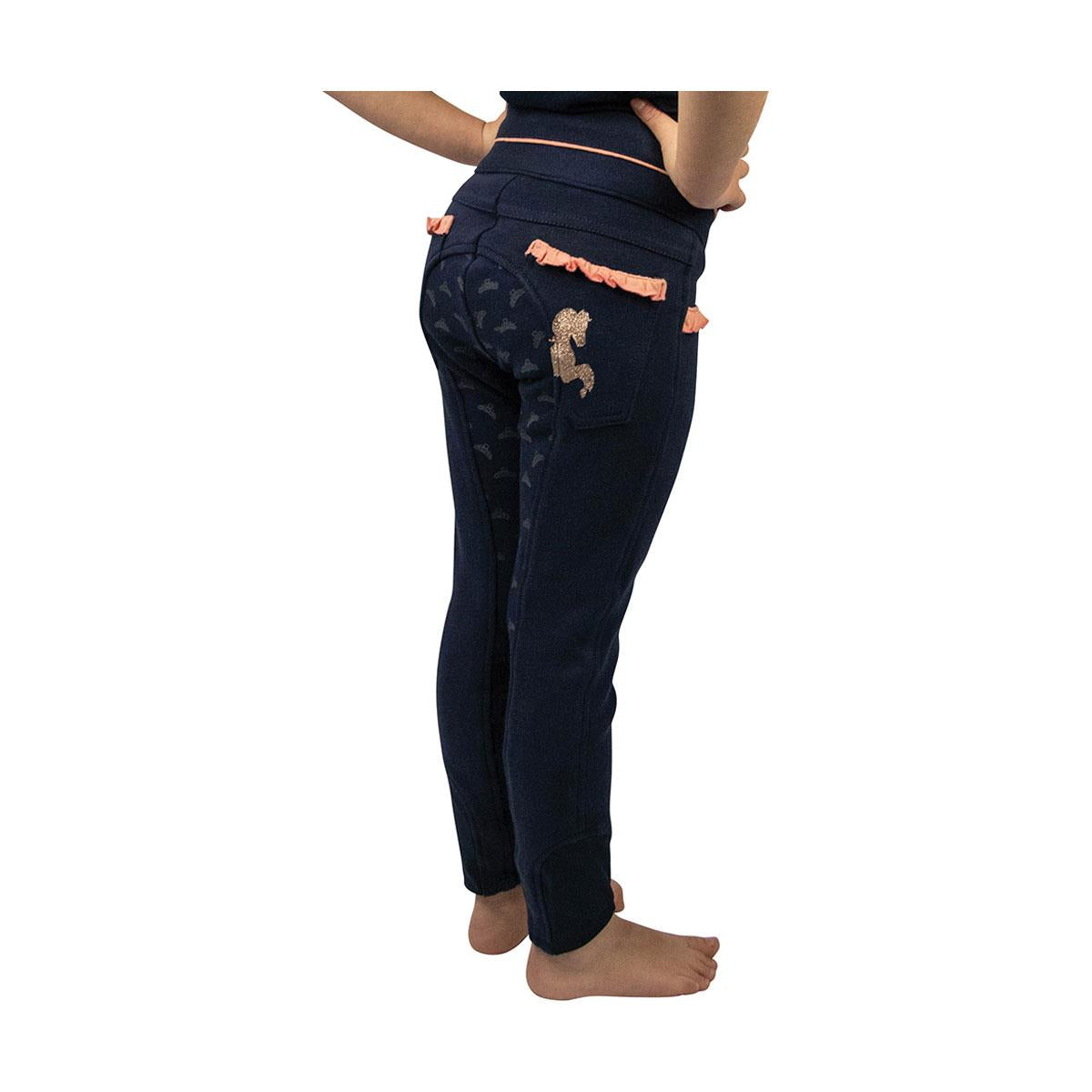 Designed in dark navy stretch material and elasticated waistband with drawstrings, your child is guaranteed to remain comfortable both in and out the saddle. The silicone crown patterned full seat and silicone ponies at the knee ensure added grip and security when in the saddle. Finished with peach frill trim, practical front and rear pockets and rose gold �Princess and the Pony� slogan and sparkly rose gold pony to the pockets. Match with the �Princess and the Pony� collection.