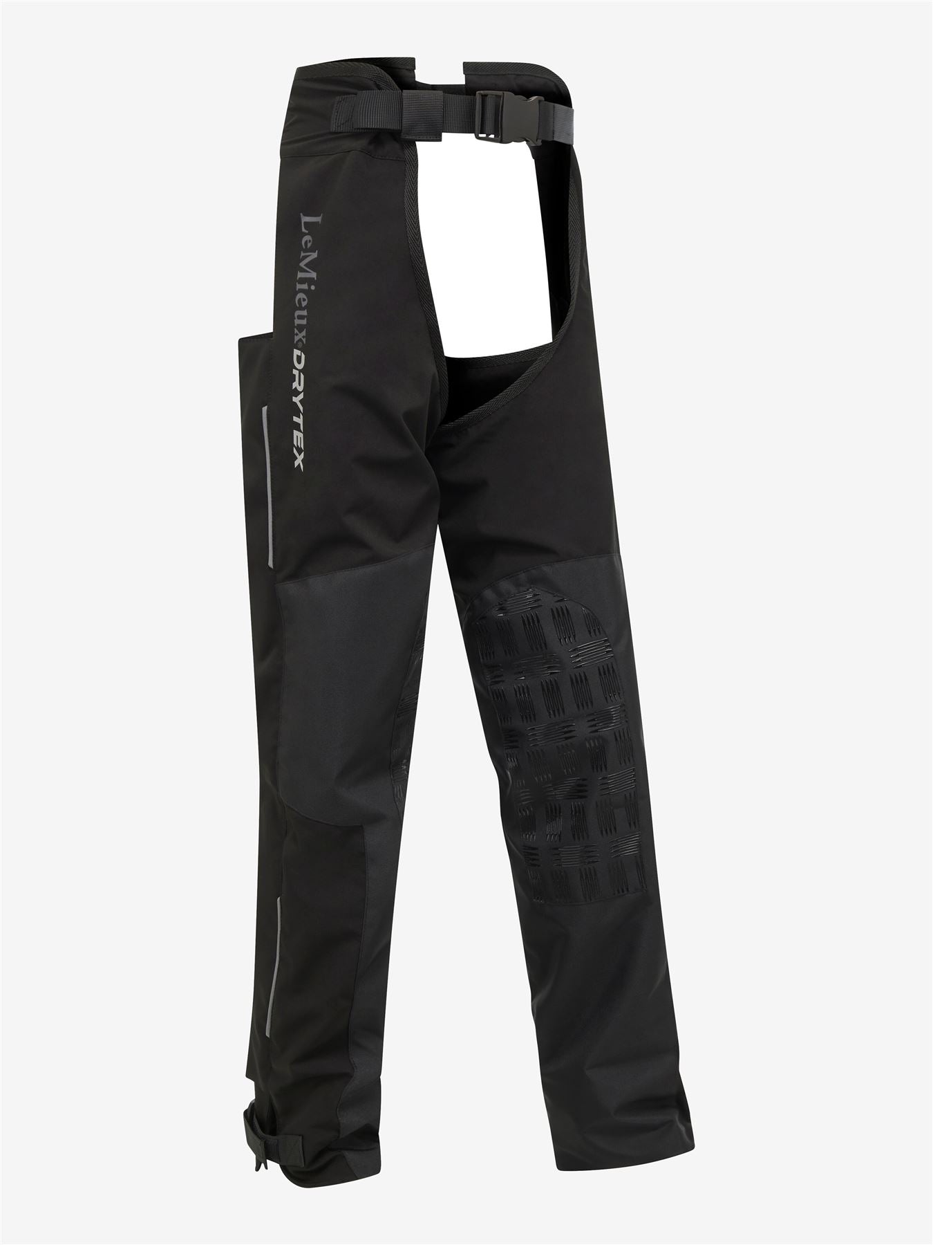 Now in Junior sizing - Take on all winter weathers with the LeMieux DryTex Stormwear Waterproof Chaps which are packed full of practical and stylish features. Made from breathable yet durable material with unique membrane and taped seams, these full chaps are fully waterproof and perfect for wet days at the yard - the rain simply beads and runs off! Waterproof rating of 5000mm and a Moisture Vapour Permeability (MVP) rating of 4000mvp. The fleece lining provides an extra layer of warmth on the chilliest of days. Elasticated foot straps stop the bottoms rising up whilst riding and the silicone knee grips ensure stability in the saddle. Reinforced knees and inner lower leg give added durability making sure these chaps withstand the hard work of winter. Elasticated waist band gives a comfortable and secure fit and the hook & loop adjustments around the bottom makes getting them on over breeches or jeans easy. Finished with LeMieux DryTex detailing and a flattering fit.