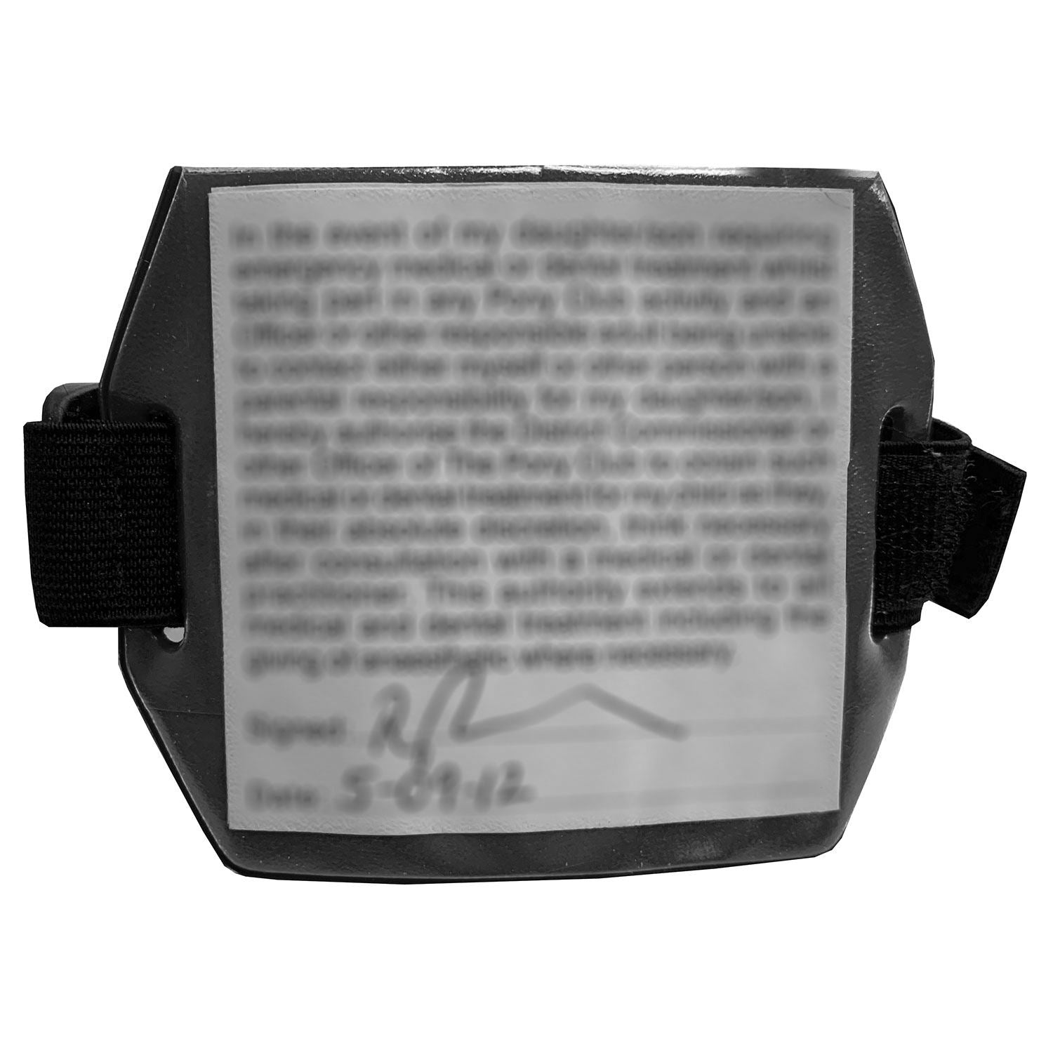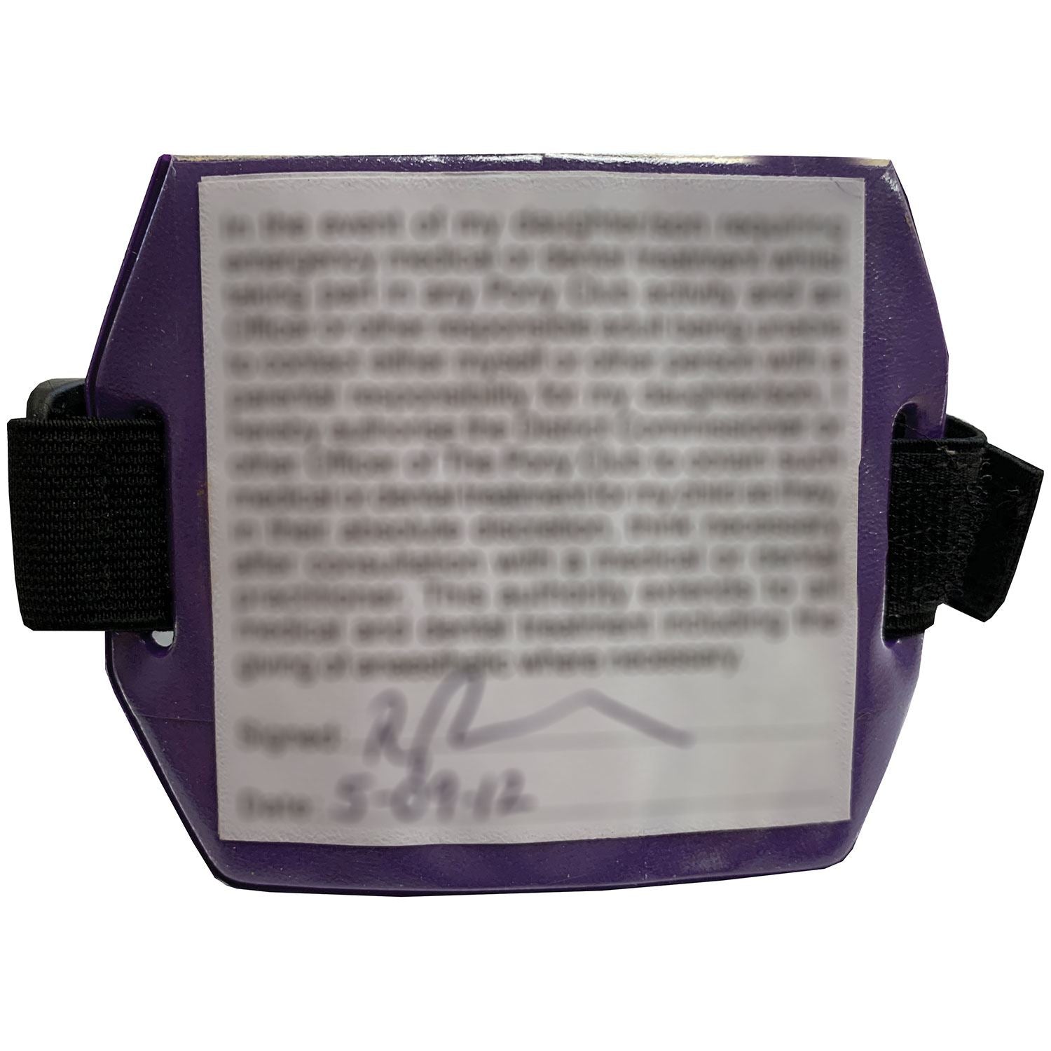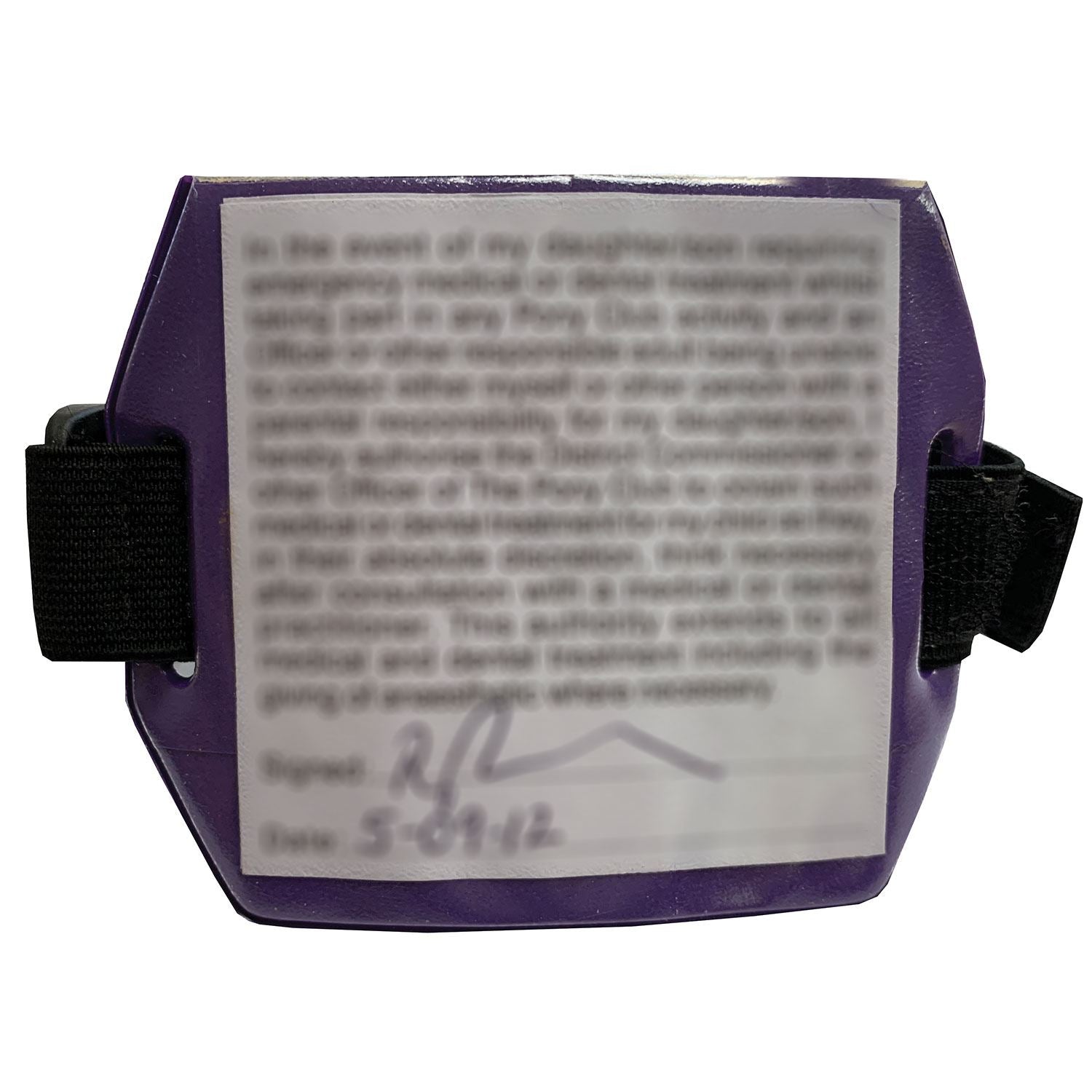 Child's purple adjustable arm band with button press close fastening to secure compulsory medical card. Made from 100% PVC, which can be wipe cleaned. The strap is elasticated and adjustable with Velcro. One size fits all! Click HERE to download the Medical Armband Form.