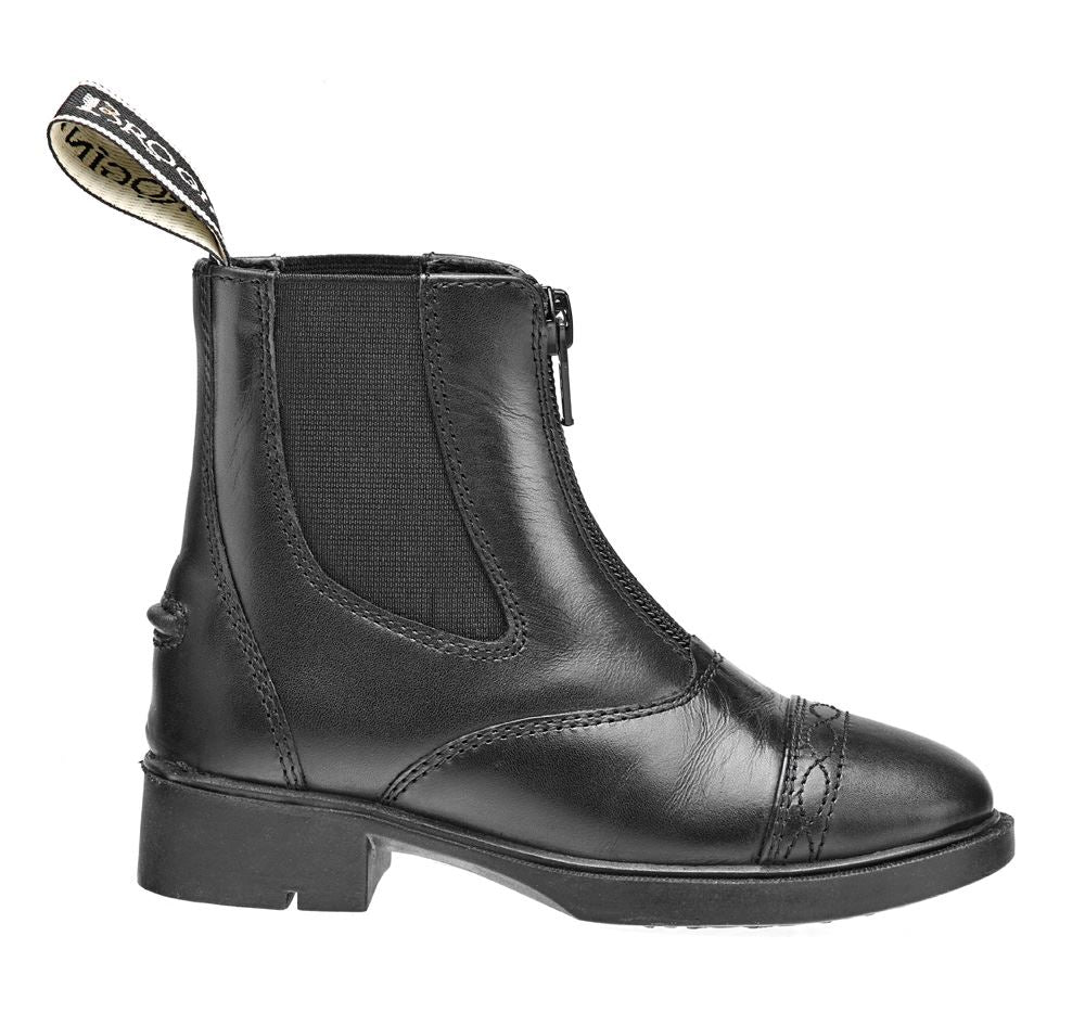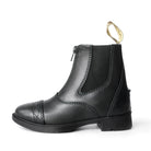 These boots feature a convenient zip along the front, making them easy to slip on and off. They also have elastic side panels for a comfortable and secure fit. At the rear of the boot, a small rubber stud is strategically placed to keep spurs in place, a thoughtful detail for young riders.