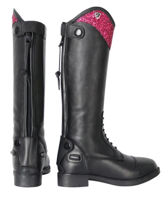 Ride in style with the all new Erice Riding Boot - the traditional field boot look with a modern twist! Featuring lace fronts for the classic finish, but with the addition of a black glitter panel at the top of the boot that will sparkle in the light. With elasticated back panel for superior comfort, ease of fastening and close contact feel and sturdy zip fastening with secure top press stud closure. Including spur rests to the heel, spur guard at the bottom of the boot and durable anti-skid sole for stability. The perfect addition to your boot collection, whether to wear every day or save for best.