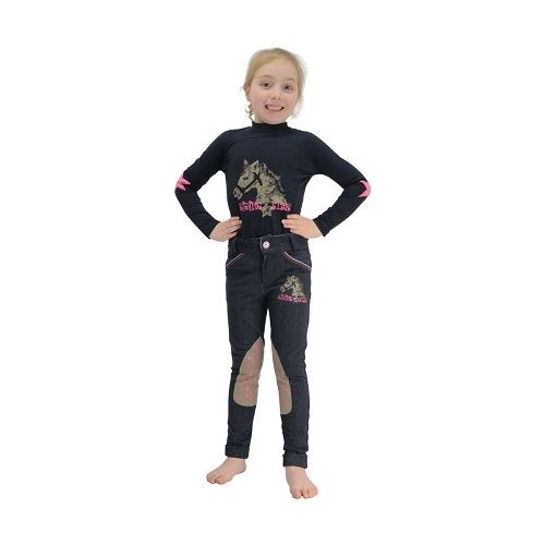 These stylish denim look jodhpurs are the ultimate in comfort and fashion, whilst being perfect for riding. Reinforced Alos knees are enhanced with pink silicon hearts and horseshoes for added grip, with the bi-stretch material offering perfect fit. The Riding Star pony print to the front of the jodhpurs is complemented by the logos on the rear pockets, and the jodhpurs are finished with a pink and navy stitch to the front pockets that also runs along the rear of the jodhpur. Easy to care for, machine washable and comfortable, these jodhpurs are the perfect choice for the active rider!