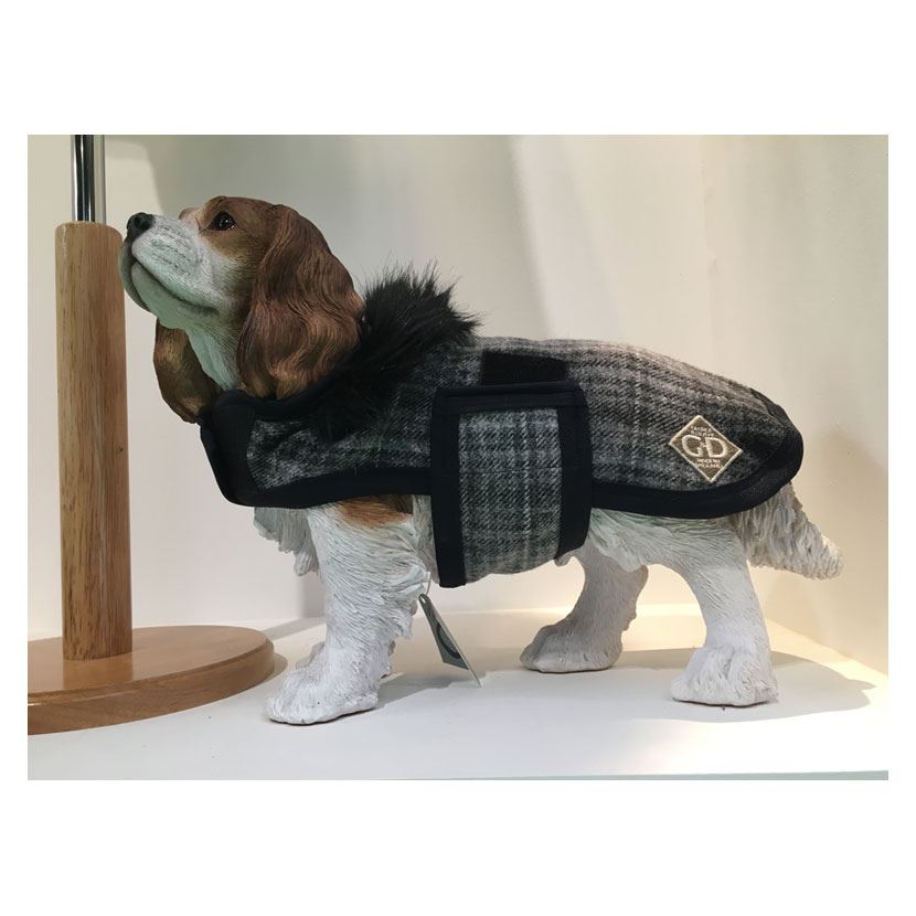 A beautiful English tweed dog rug in a classic Light Charcoal check. The natural looking Black faux fur collar lifts the dog rug to give a luxurious look and feel. Matches with the Claire Cape. Dry clean only. X Small: 12 - 14". Small: 14 - 16". Small/Medium: 16 - 18". Medium: 18 - 20". Large: 20 - 22". X Large: 22 - 25".
