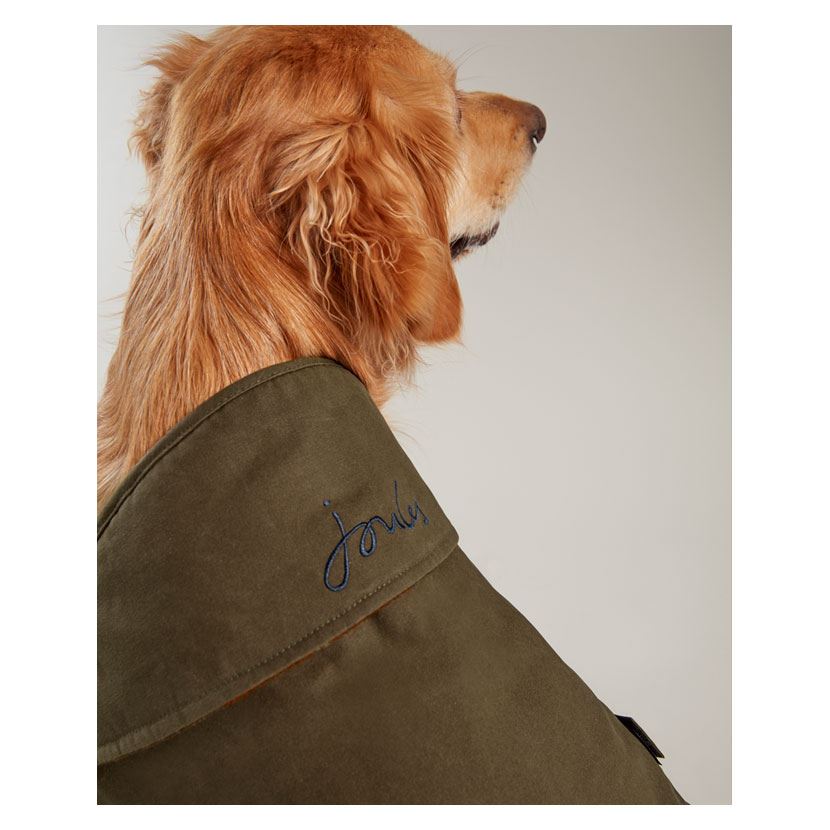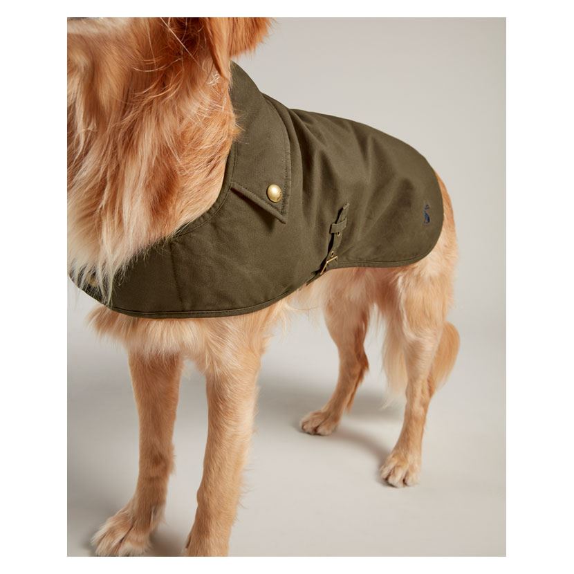 The ultimate country-inspired dog coat. Warm, cosy wax cotton jacket with tweed lining that is quick to put on and take off with easy Velcro fastening. Complete with adjustable straps and back opening for securing lead or harness and finished with Joules embellishments.