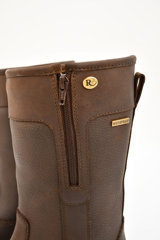 A refined classic mid-calf country boot with subtle logo hardware detailing and a half side zip for confident use and fit. The Hampton is a waterproof country boot that is ready for anything. Please note: These boots are not designed for riding and doing so may result in non-returnable faults Waxy finish leather foot and upper. 100% Waterproof boots to keep your feet dry in wet environments. Insulated for added warmth. Shorter style mid-calf length boot. Half size zip for easy on/off. Foam padded inner soles for an all day comfort fit. Energy return sole unit for durability. Embossed Rhinegold branding at the heel and subtle gold coloured pin detailing.