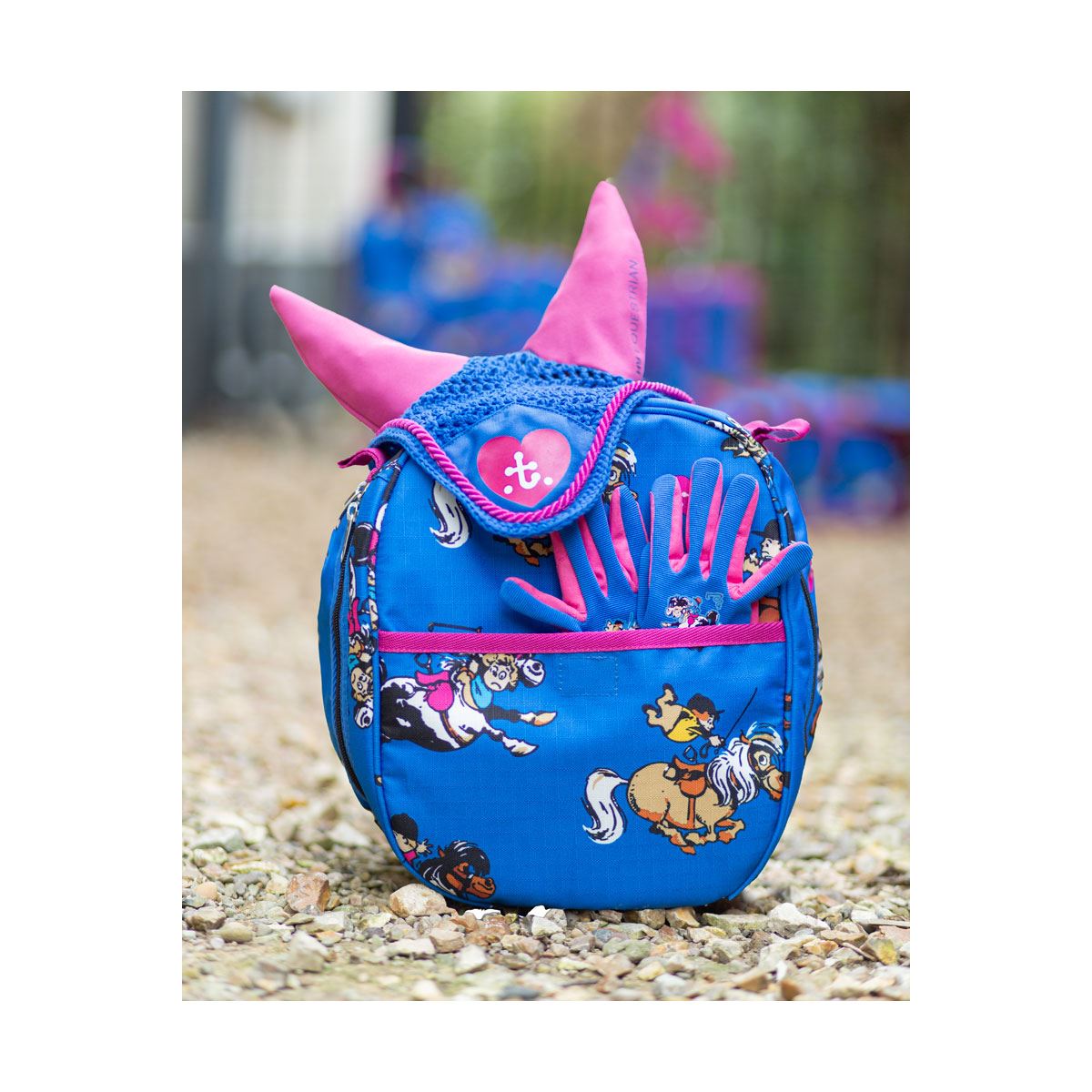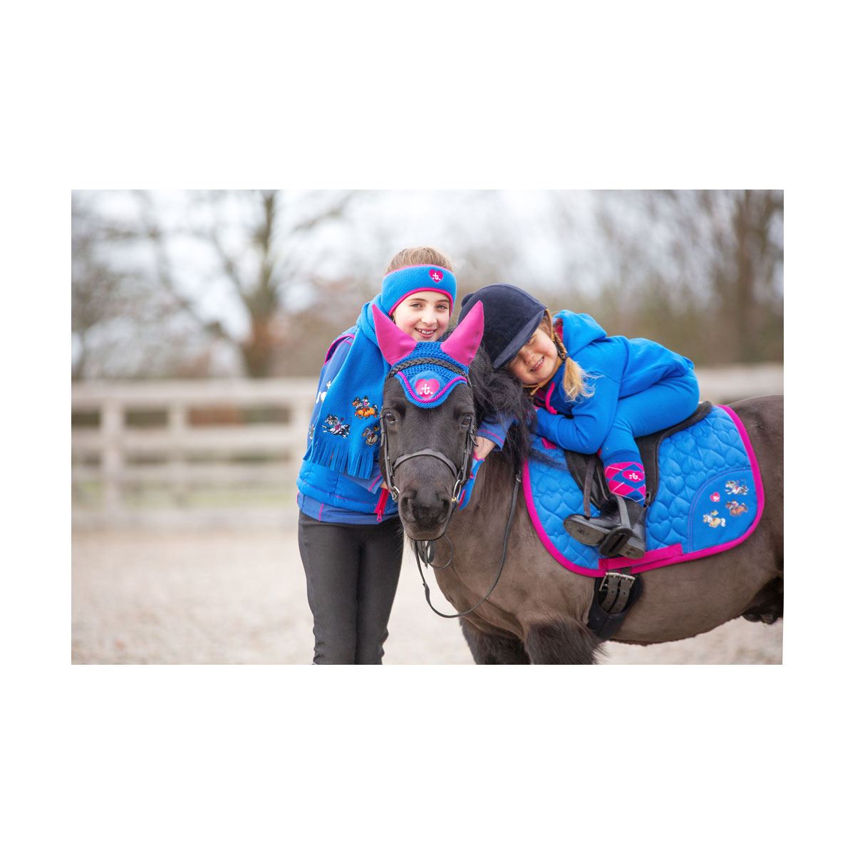Keep your pony protected from the flies with the new Thelwell Race Collection Fly Veil. This blue veil is made from a crochet material and breathable fabric ears for superior comfort. Featuring magenta binding and Thelwell logo to match the rest of the collection.