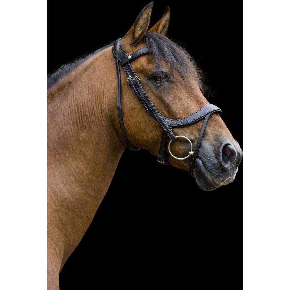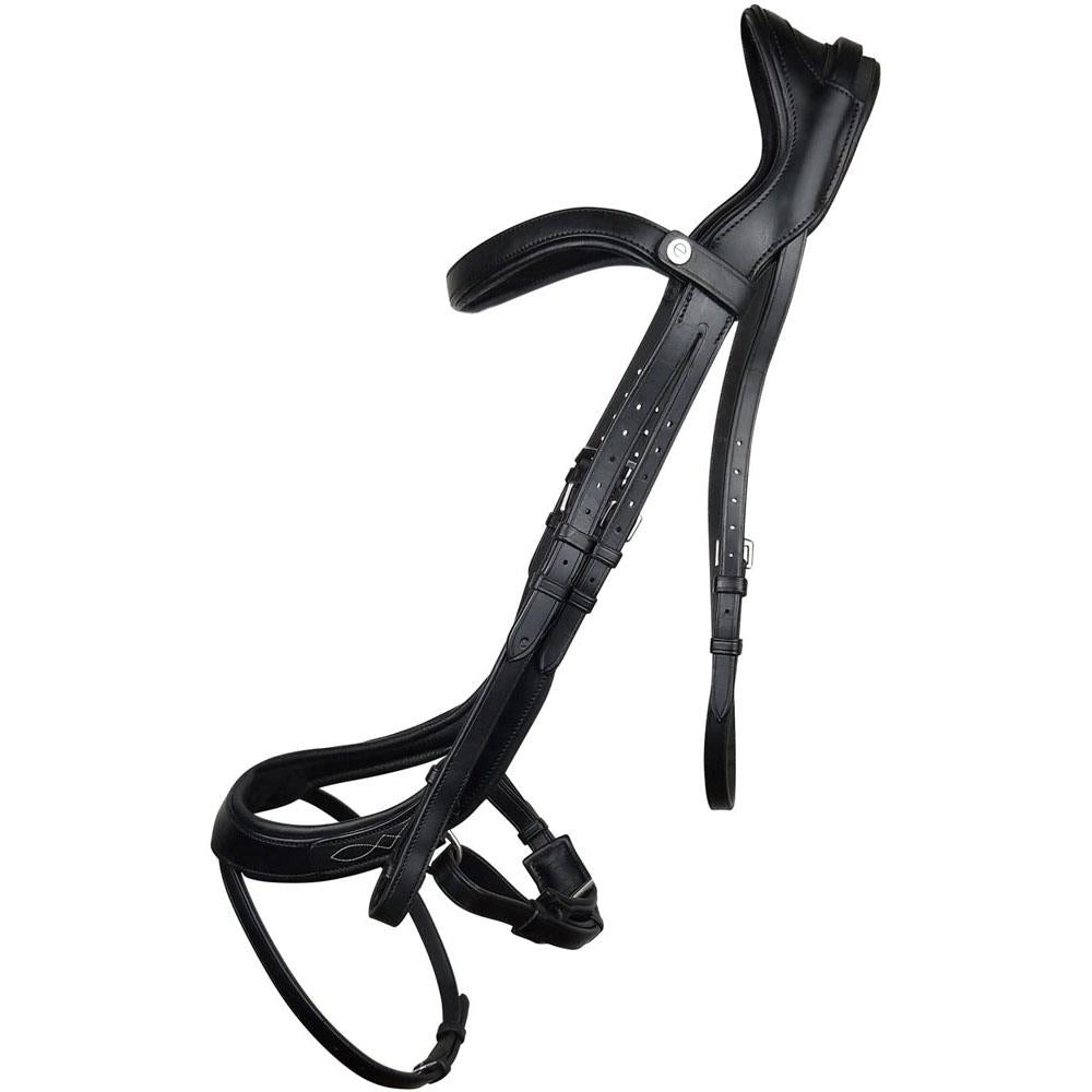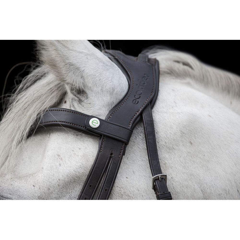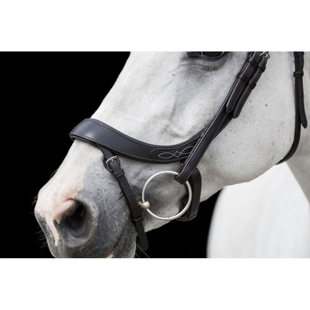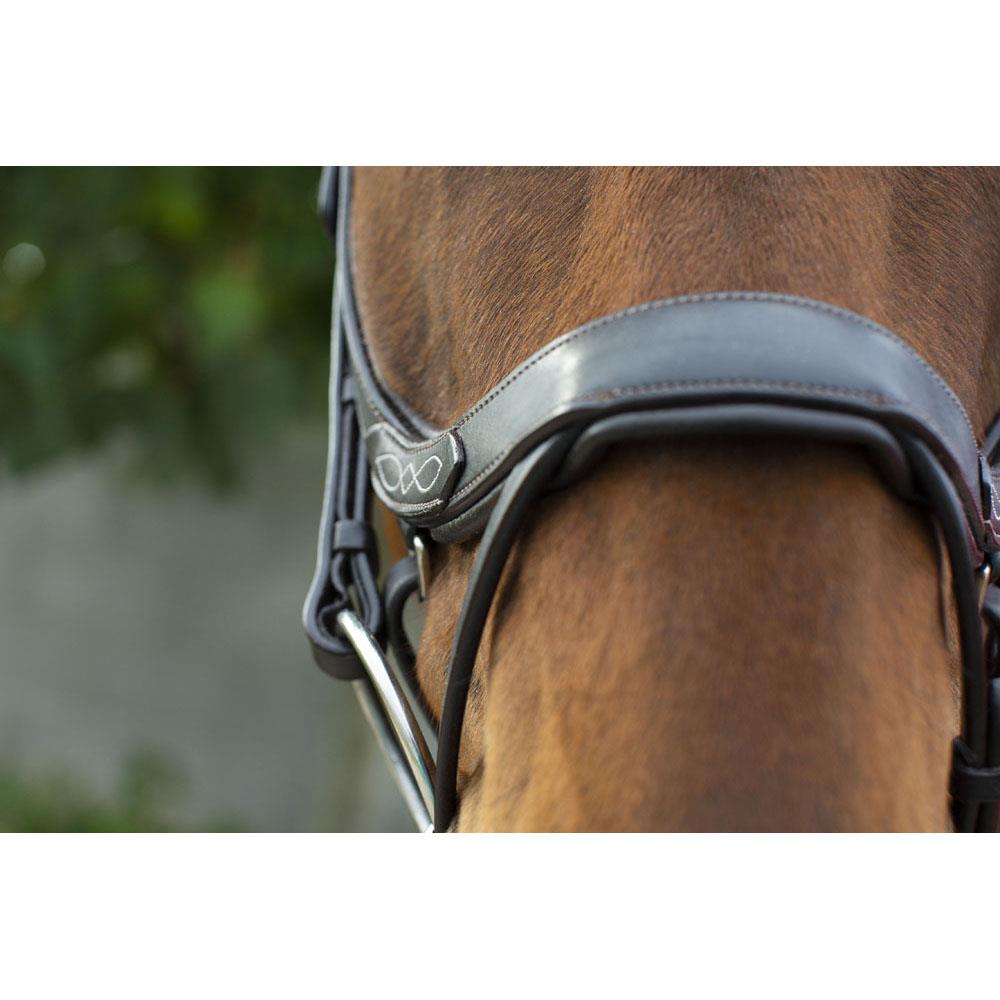 The bridle is further enhanced by a perfectly positioned throat lash sitting at the correct angle to relieve pressure under the chin. The bridle is also set off with a dipped browband, removeable with our signature "e-clasp" that feeds through a padded channel offering yet more comfort to the sensitive lower ear.