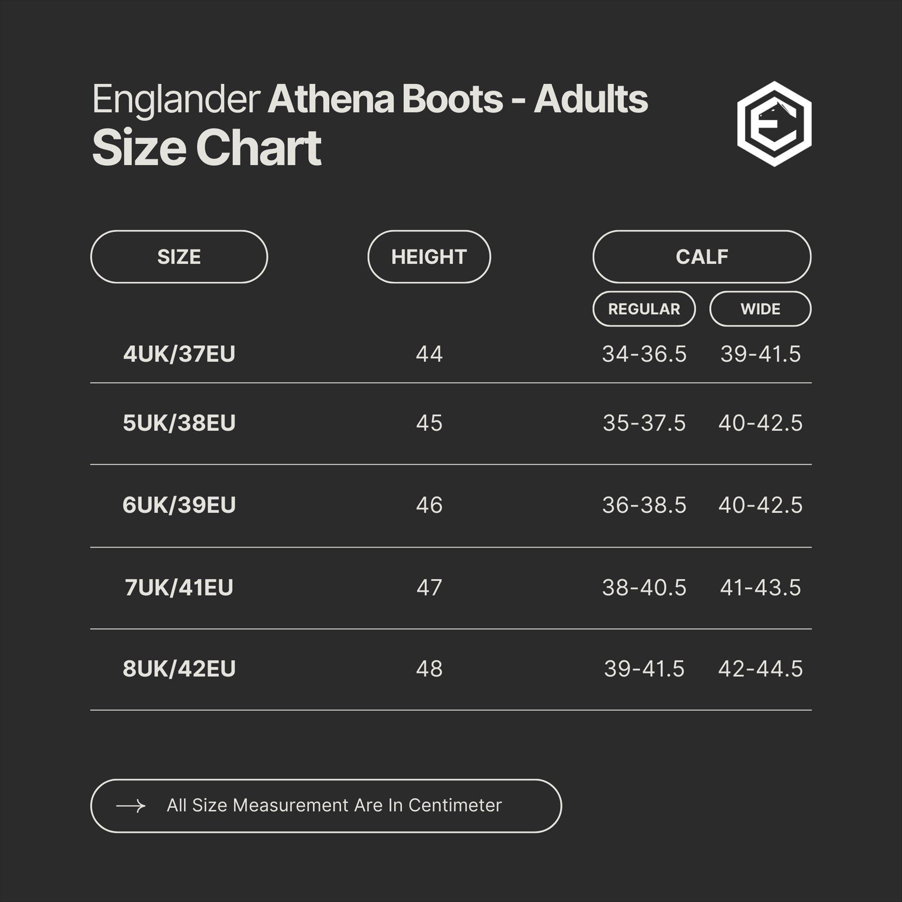 The adult Athena boots are available in sizes UK 4 / EU 37 to UK 8 / EU 42, with both standard and wide calf fits for a more personalised feel. The stretch panel along the calf gives an incredibly fitted look, helping riders with different leg shapes find a boot that actually fits.