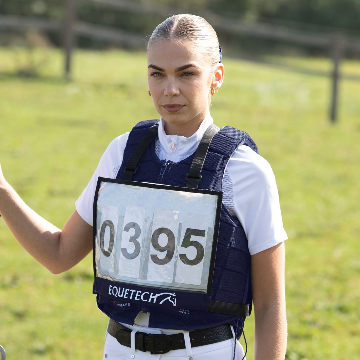 A number bib is an essential part of your eventing competition kit to hold your number in place. A durable, practical and comfortable number bib with clear plastic window front and back. Velcro fastening to windows. Adjustable shoulders and elasticated side straps. Machine washable. 100% Polyester. (Eventing Numbers sold separately)