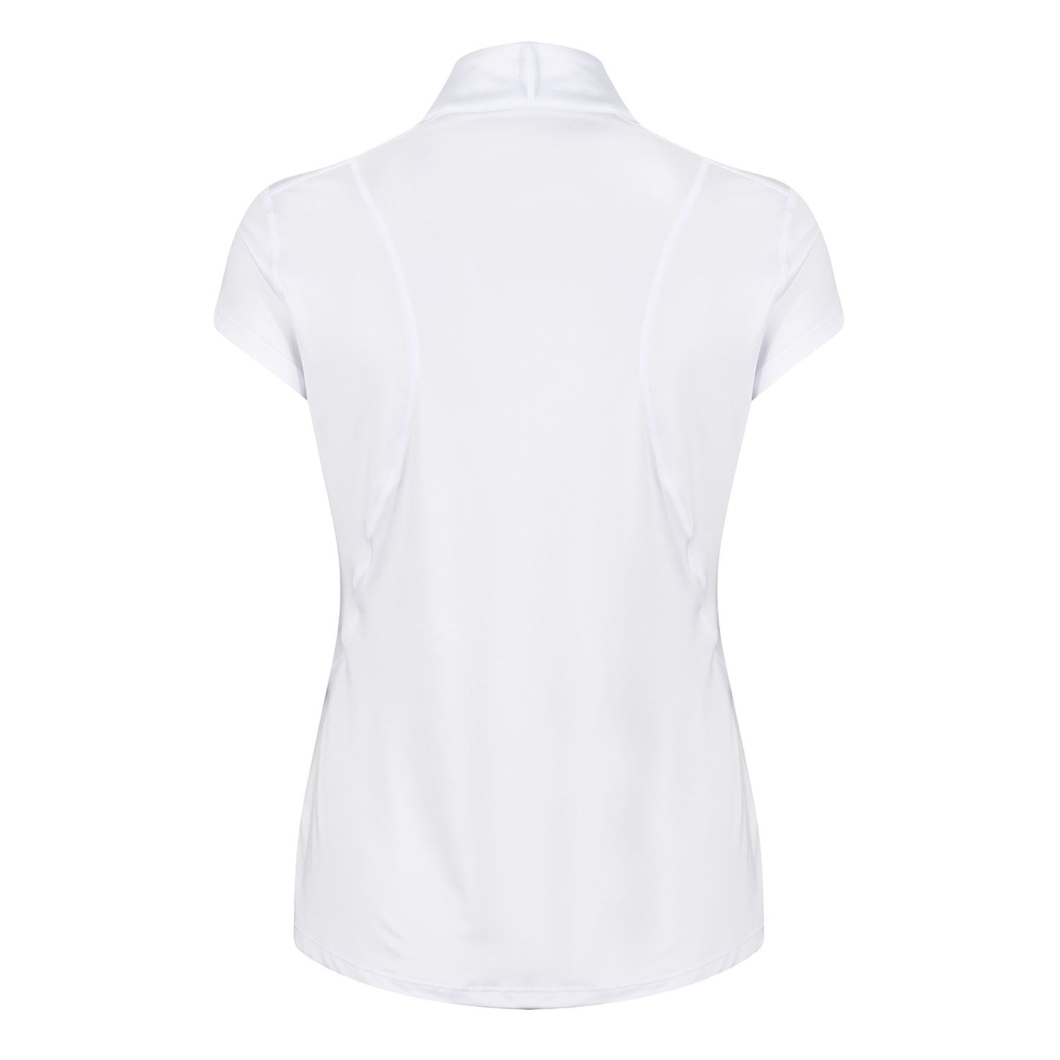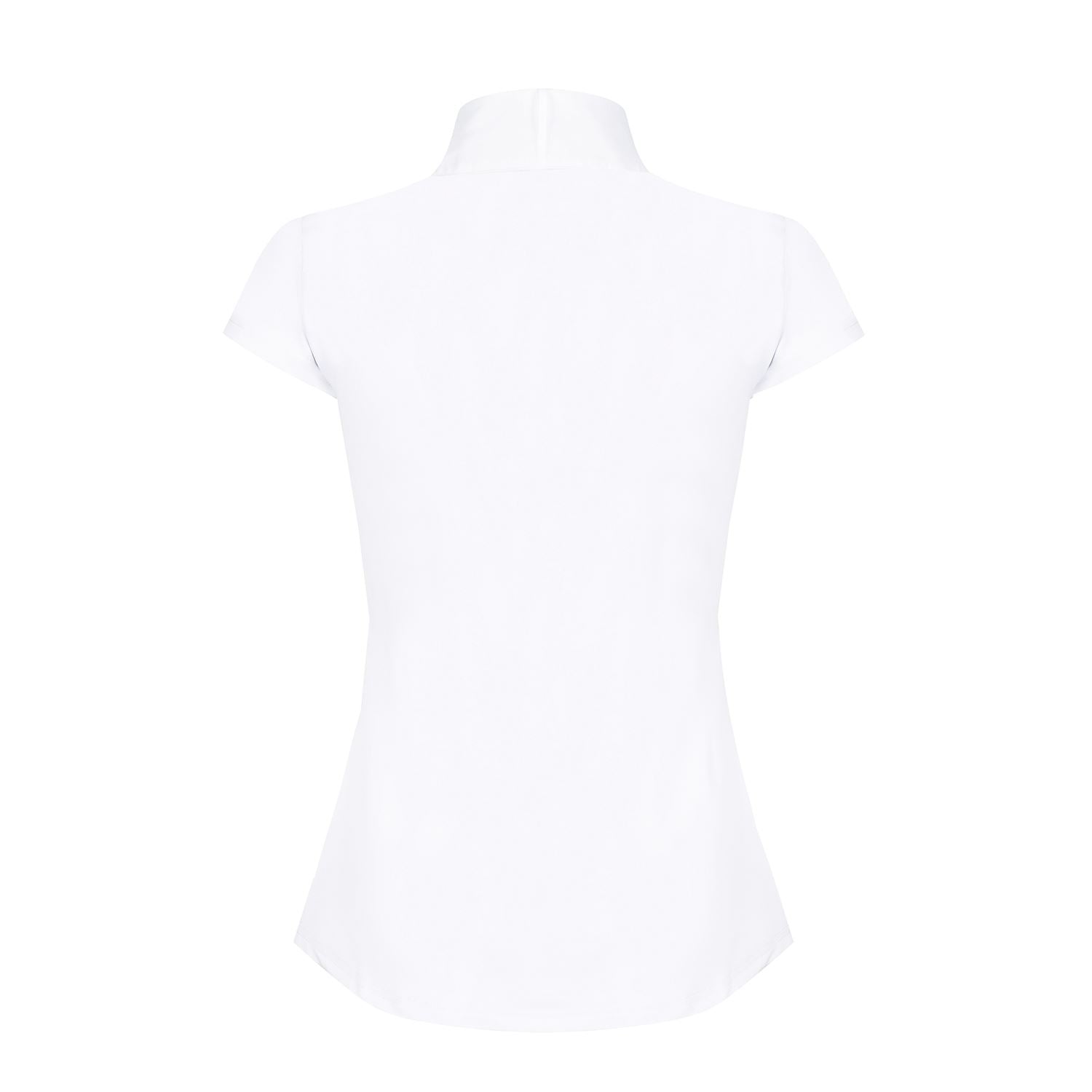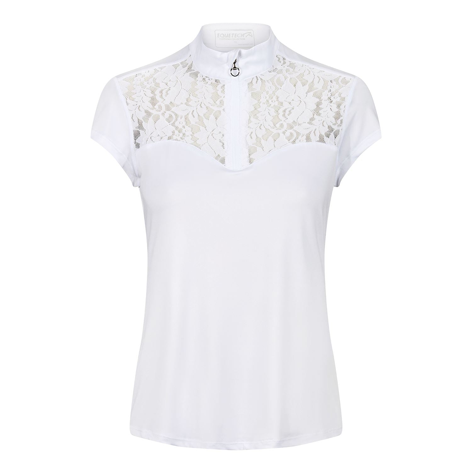 Exquisite lace panelled shirt, which can be concealed with stock. Made from technical stretch fabric. Perfect for competition and casual wear. Features a stock (ratcatcher) collar with zip for ease of use and sweat heart cut to bust, loop to back of neck and scooped back hem. Machine washable. 95% polyester / 5% Lycra.