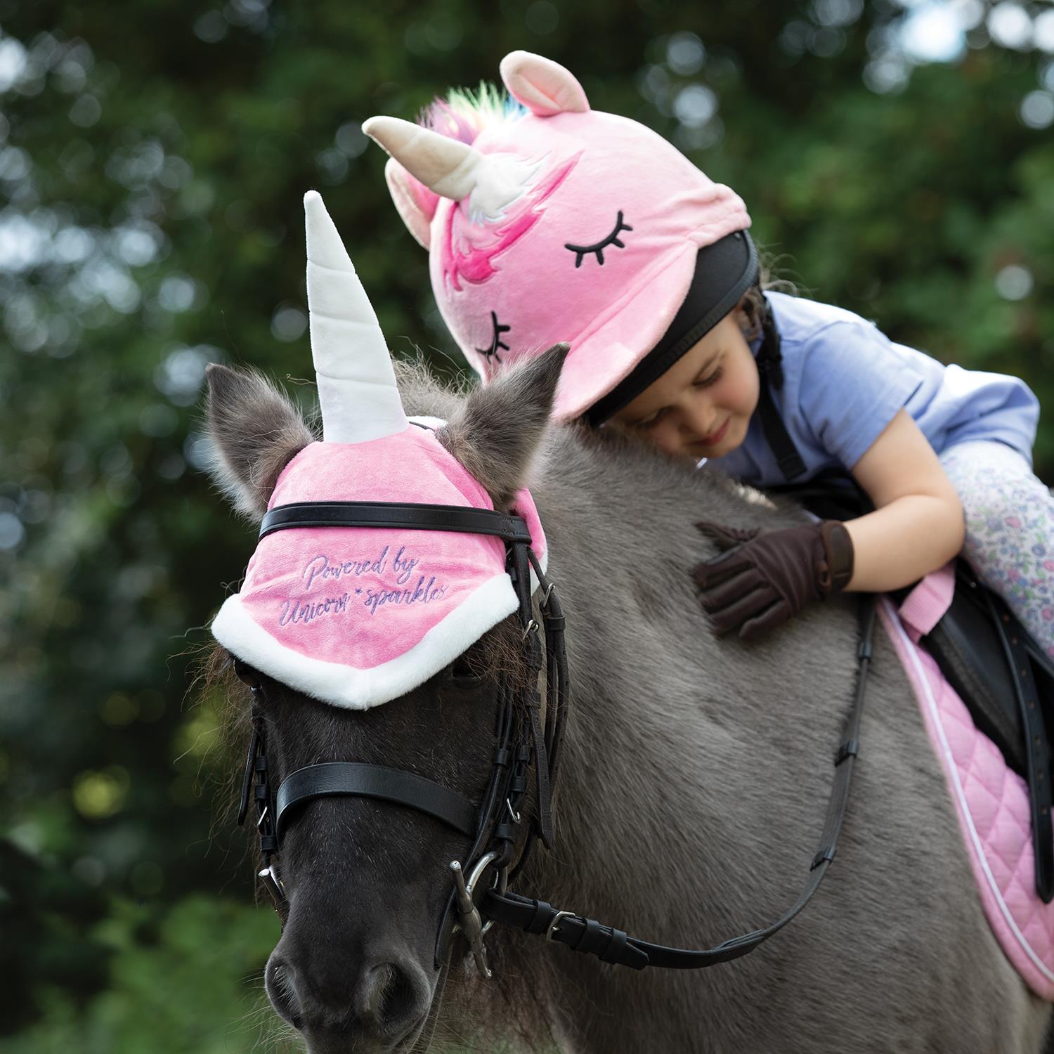 Limited Edition - Unicorn Horse Bonnet. Get the Unicorn look with this plush pink fly hood/ veil�for your horse! Features contrast trim and a 3D White unicorn horn.�A must have Unicorn accessory! Two sizes! Matching Unicorn Hat silk also available. Machine washable. 100% Polyester.