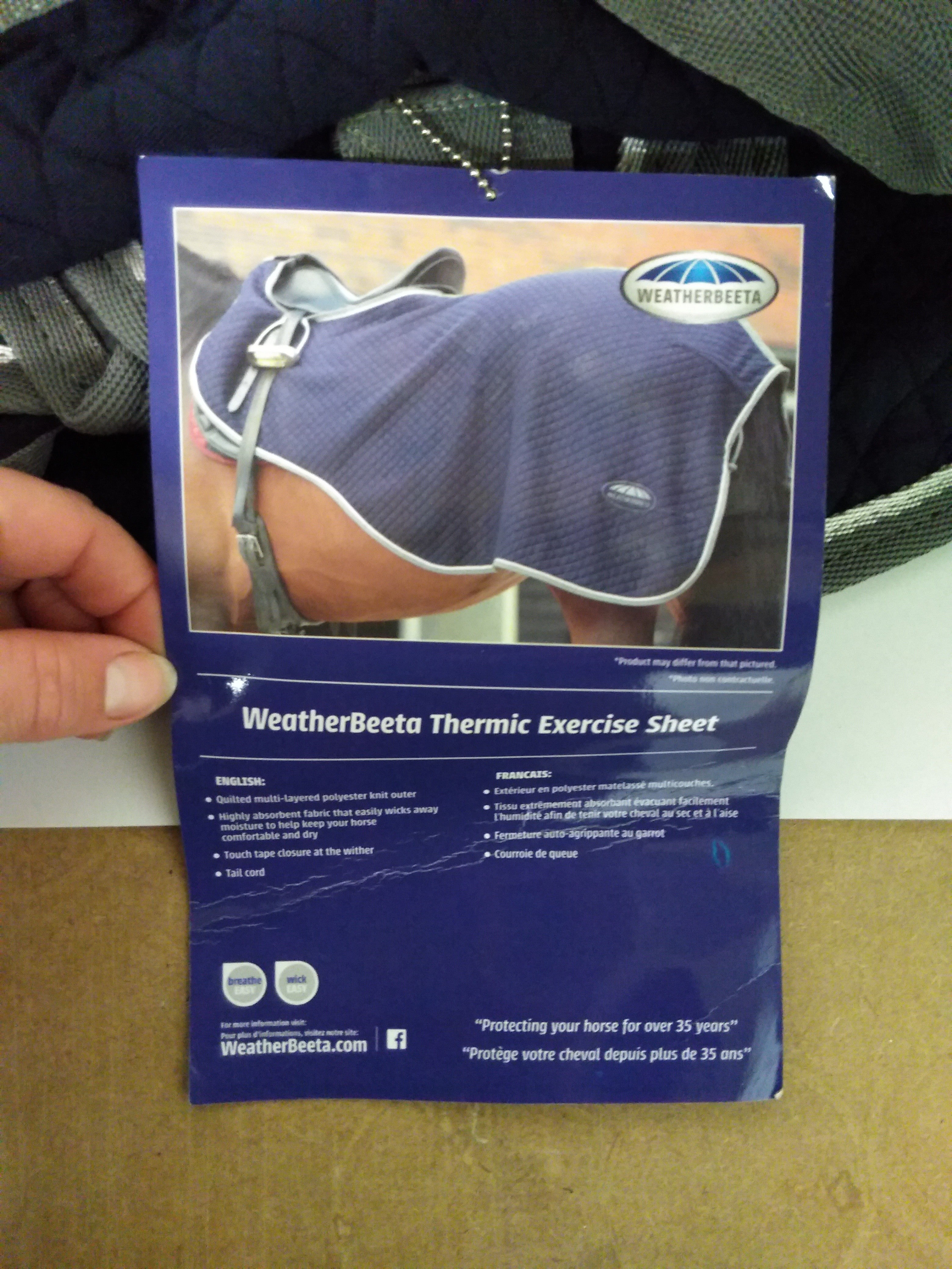 The Weatherbeeta Thermic Exercise Sheet is designed to keep your horse warm and dry during exercise in cooler weather. This high-quality sheet features a navy, grey, and white colour scheme and is made from durable materials. Although the packaging is damaged, the exercise sheet itself is brand new and ready for use.