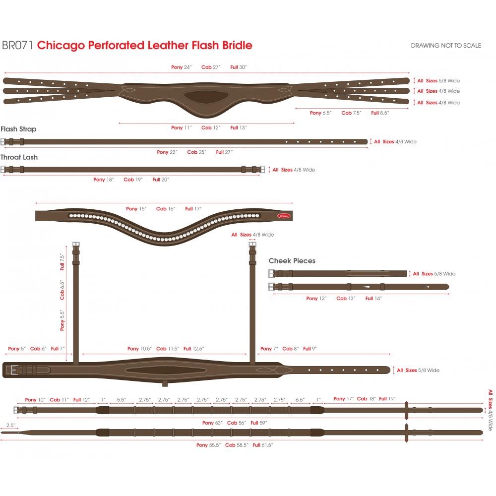 Crafted from an absorbent and breathable leather, the Chicago Bridle comes complete with elegant diamante browband and 9 loop rubber reins. The wide headpiece and noseband ensure pressure is evenly distributed whilst the quick drying and perforated leather ensures brethability and has excellent moisture wicking properties. Made from vegetable tanned, eco friendly leather. Features: - Wide Headpiece & Noseband Padding Detail for even pressure distribution - Decorative Contrast Stitch - Red Whitaker Badge - Stainless Steel Hardware - Moisture Wicking Leather - Black or Brown- Pony, Cob or Full - Includes 9 loop Rubber Reins