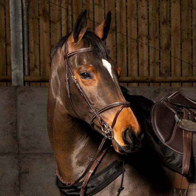 The luxurious Valencia Flash Bridle is crafted from soft yet hardwearing luxury leather which is padded for the horses comfort and delicately finished with contrast pattern stitching along the browband and noseband. Crafted from the hightest grade leather and with fine, elegant raised strapping, the valencia collection from John Whitaker is perfect for competition use and comes in a striking tan colour as well as rich havana and glossy black. FEATURES - Comes with 1/2" 9 loop Rubber Reins - Raised decorative stitching to noseband and browband - Monocrown headpiece with inner well - Blue John Whitaker Performance Badge - Padded nosepiece for extra comfort - Flash piece included - Available in black, light havana or oak brown - Pony, cob and full sizes available Tan colour not held in stock, takes 8 weeks from order.
