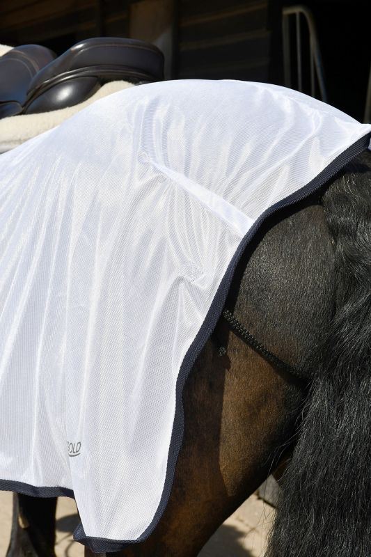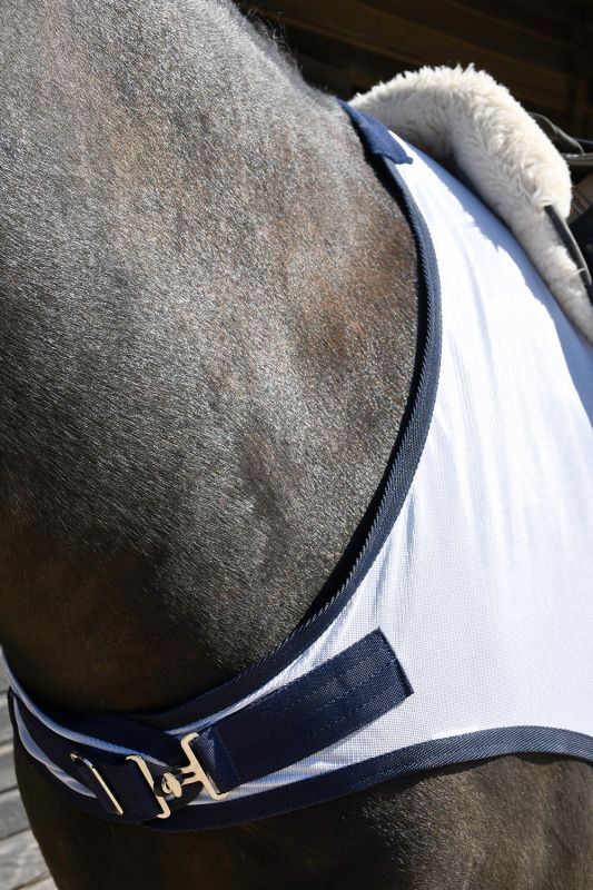 Featuring a cutaway shoulder design for freedom of movement and ultimate comfort when in use. The soft fleece wither pad will aid to reduce any rubbing or pressure at this point.These ride on rugs have been designed to sit underneath the saddle with a fillet string to ensure secure placement. Lightweight and breathable mesh material for fly and UV protection when riding.