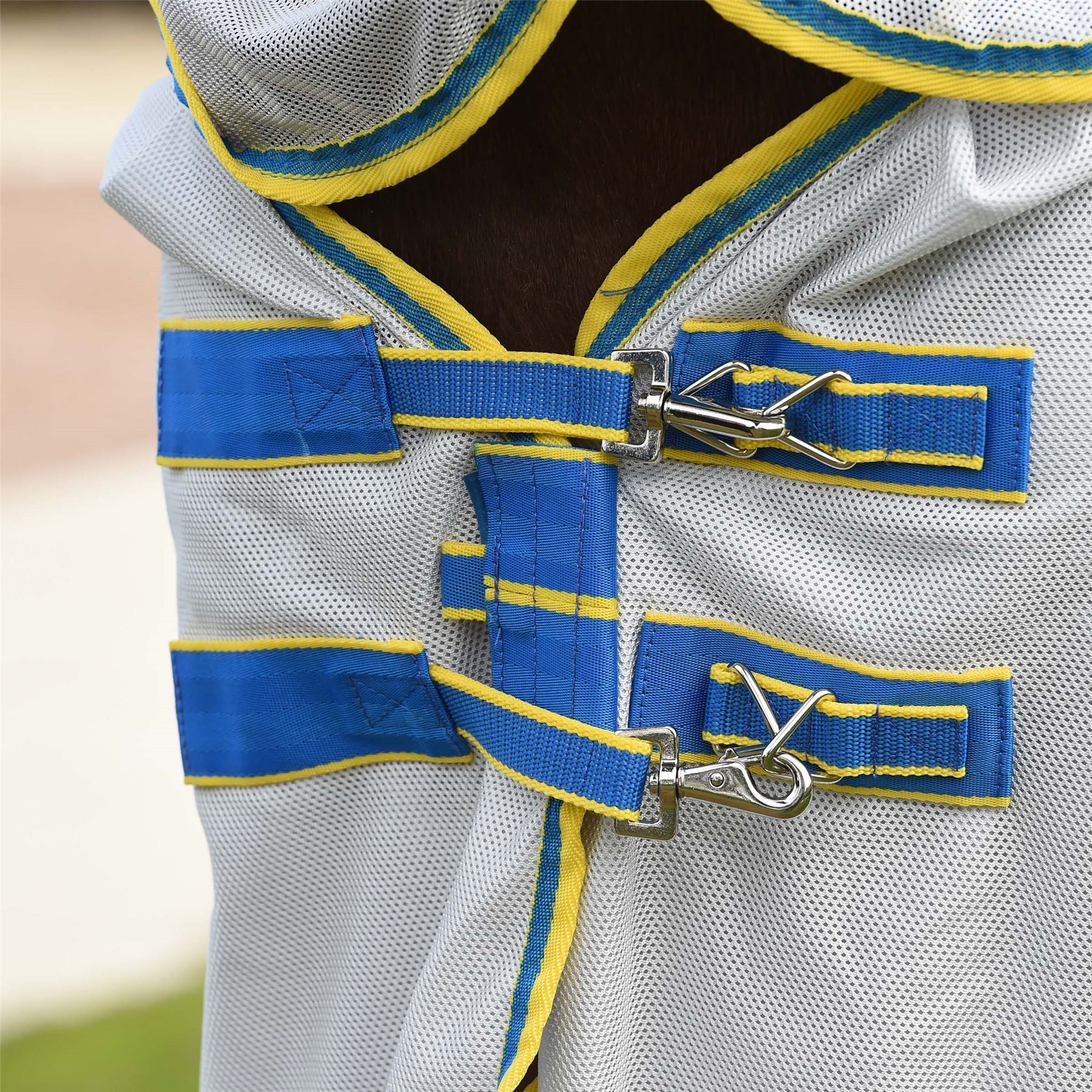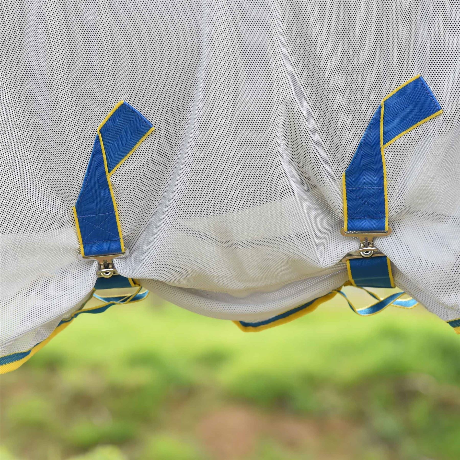 The WeatherBeeta ComFiTec Zephyr Plus Mesh Combo Neck fly rug provides extra airflow and comfort with an open weave design that keeps your horse cool and comfortable in hotter conditions. Offering 220gms of soft open weave design for optimum airflow, with a full wrap tail flap that has a two piece design that wraps around the horses quarters for maximum protection, elastic insert at the wither for additional comfort while grazing and Ultra belly wrap for extra protection from flies. In addition, this fly rug offers an adjustable Ezi-clip front closure with sandwich press touch tape that's fast and easy to use, traditional side gusset for freedom of movement with lined shoulders, mane and tail flap to help prevent rubbing and elasticated adjustable and removable leg straps. Providing over 75% UV block.
