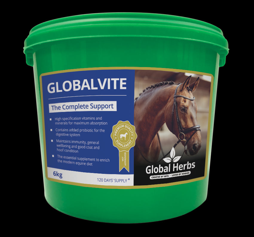 High quality multivitamin supplement for horses GlobalVite is packed full of premium and unique chelated (protein bound) minerals which makes them easy for your horse's body to absorb. Each serving is packed with essential vitamins. These important minerals are ideal for supporting general bodily functions, maintaining peak condition, and immune system stability. GlobalVite helps to support healthy joints, skin, hooves, and much more. Great for changeable weather conditions, GlobalVite tastes delicious and can be fed all year round. Suitable for all horses and ponies. Ingredients Calcium Carbonate, Mono-Calcium Phosphate, Magnesium Phosphate, Sodium Chloride, Hemp Seed, Mineral Oil, Seaweed Meal, Mojave Yucca. Per 1kg of GlobalVite: Vitamins Vitamin D3 E671 120000 iu Vitamin A E672 470000 iu Vitamin E E306 2300 iu Vitamin B1 3a821 65mg Vitamin B2 66mg Vitamin B6 3a831 63mg Vitamin B12 1125mcg Biotin 3a880 115mg Vitamin K 3a711 63mg Trace Elements Ferrous Chelate of Glycine Hydrate E1 Iron 500mg Iron Sulphate Monohydrate E1 Iron 4400mg Calcium Iodate Anhydrate E2 Iodine 314mg Copper Sulphate Pentahydrate E4 Copper 925mg Copper Carbonate Monohydrate E4 Copper 500mg Manganese Chelate of Amino Acids Hydrate E5 Manganese 1150mg Manganous Oxide E5 Manganese 849mg Copper Chelate of Amino Acids Hydrate E4 Copper 575mg Zinc Chelate of Amino Acids Hydrate E6 Zinc 2300mg Zinc Oxide E6 Zinc 2699mg Sodium Selenite E8 Selenium 20mg Organic form of Selenium produced by Saccharomyces Cerevisae CNCM-13399 3b812 5mg Gut Flora Stabilisers Live Yeast (Saccharomyces Cerevisae) 4b1702 100x109 CFU Feeding Feed 3 x 25ml level scoops daily for an average 500kg horse. Reduce to half this amount for maintenance levels. GlobalVite can be fed throughout the year.