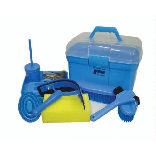 Shop now at Just Horse Riders for the Roma Ultimate Grooming Kit with 10 essential pieces for all your equine care needs. This comprehensive grooming set includes a sturdy grooming box, a hoof pick with an attached brush, a generously sized sponge, a practical plastic sweat scraper, a 7'' dandy brush, a 5'' rubber curry comb, a 4'' plastic mane comb, a hoof oil brush and pot, a 5.5'' body brush, and a packet of 500 plaiting bands.