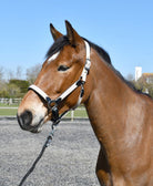 Beautiful Webbing and Leather Headcollar. Padded leather at the crown, noseband, throat piece and the cheeks. Quality webbing doubled for strength with a high sheen finish for a luxury look. With a fully adjustable noseband, double side adjustments on the headpiece and a snap hook at the throat. Available in Black or Brown Leather with Contrasting Cream Coloured Webbing Padded Crown Double Sided Headpiece Adjustment Fully Adjustable Noseband