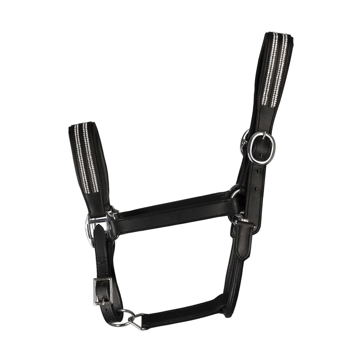 The perfect head collar to add a touch of sparkle! Encrusted with diamantes, this gorgeous leather head collar is partnered with silver hardware for a fully coordinated look. Finished with shaped, fully adjustable head piece, noseband and clip throat fastening.