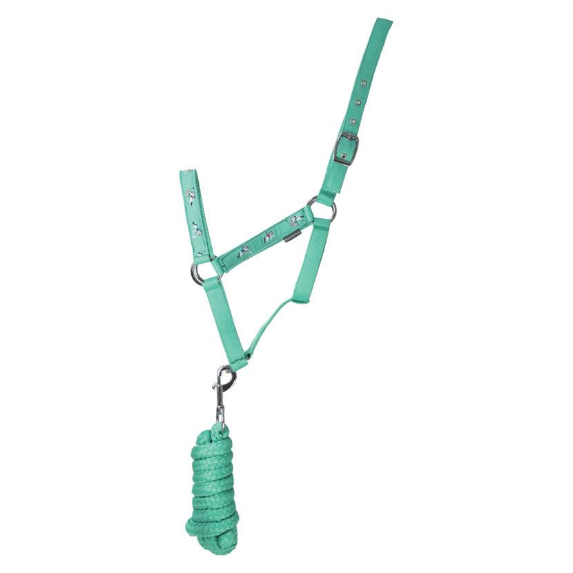 This adjustable head collar is adorned with the competition ready print, that features dressage riders, show jumpers and eventers. This vibrant green head collar matches the rest of the collection and comes with matching lead rope.