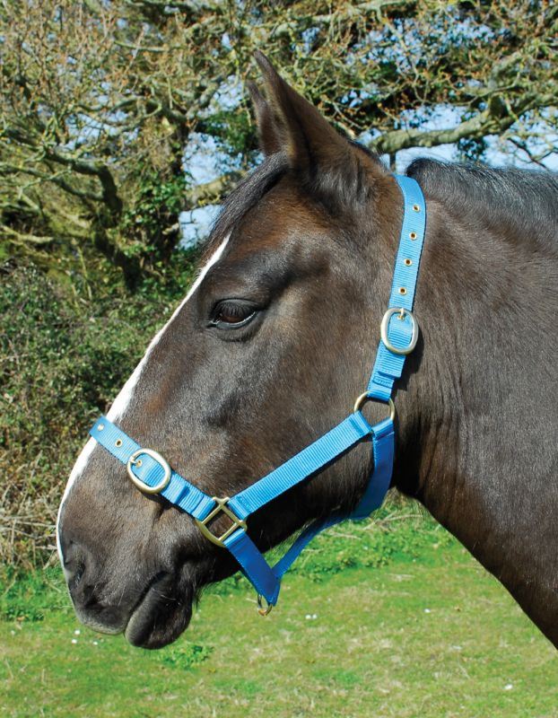 Nylon headcollar is made from a double layer 1" nylon web. It features an adjustable headpiece and noseband with brass eyelets and buckles. A strong and great value headcollar for everyday use.Baby Blue Black Black/Purple Black/Red Brown Burgundy Green Lilac Navy Pink Plum Purple Royal Blue Raspberry Red Tangerine Turquoise Red/White/Blue