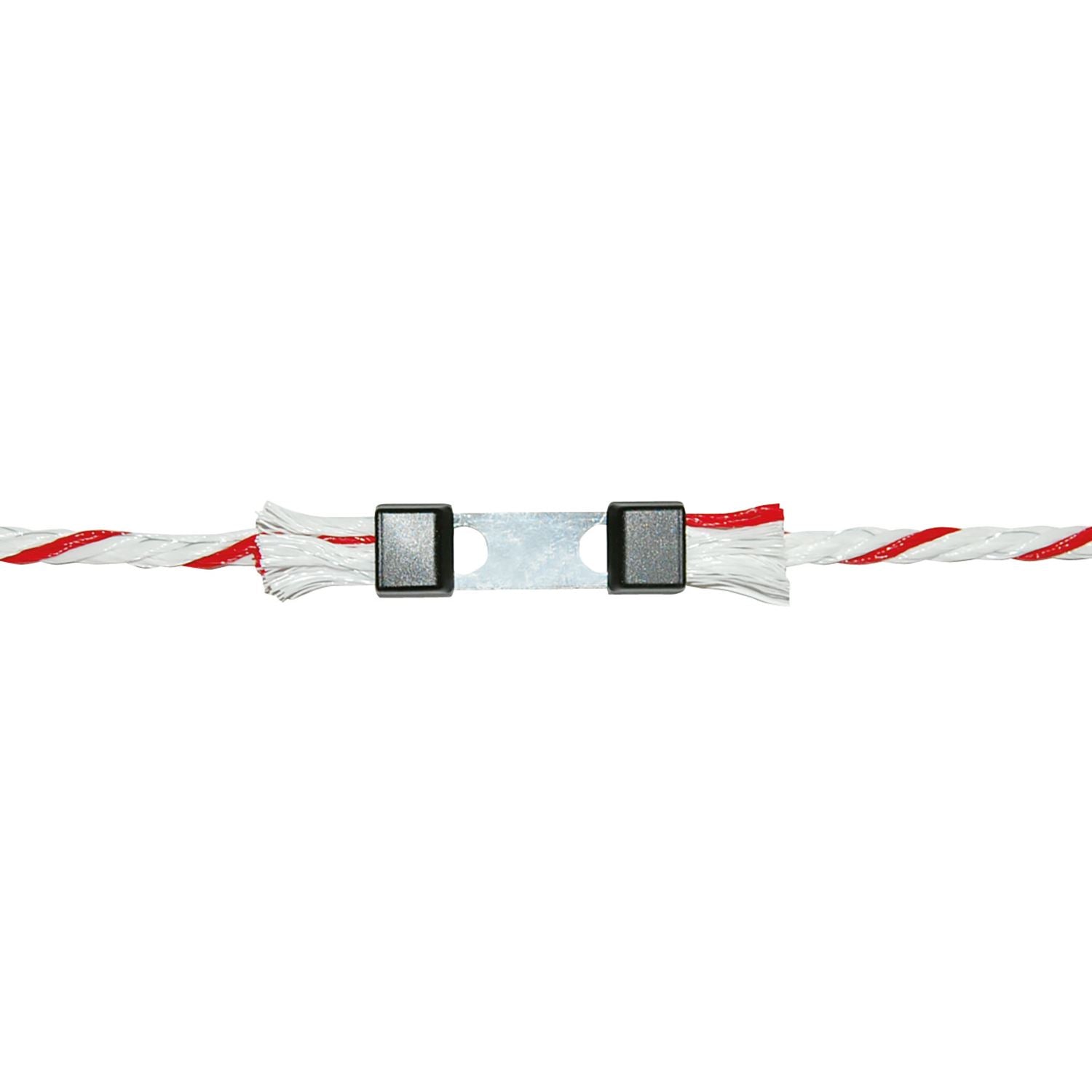 Galvanised rope connector for ropes of 5mm in diameter. For the easy connection of two rope ends, the quick solution for repairing torn fence ropes. With special key-shaped punched openings for the easy introduction and secure fixing of the rope.