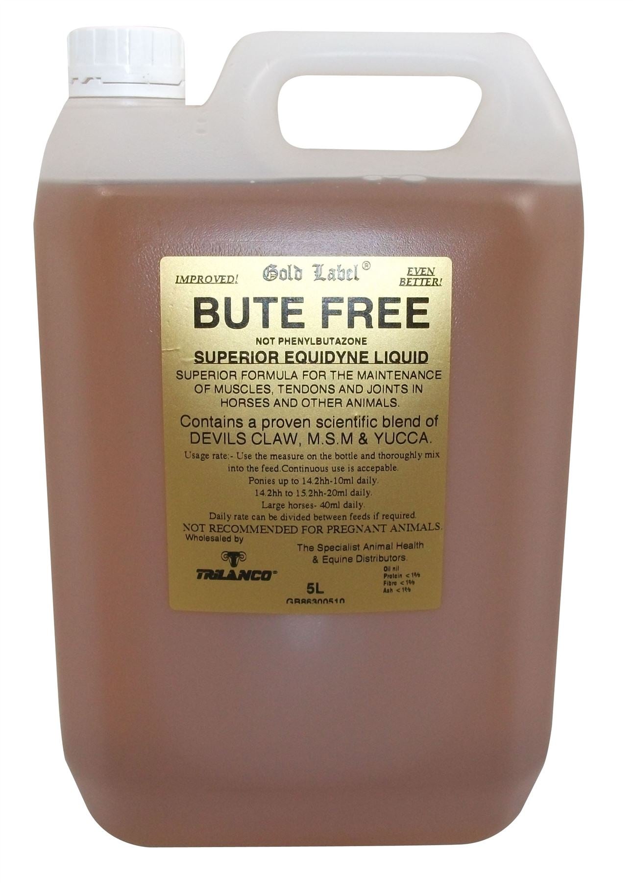 Shop now at Just Horse Riders for the Gold Label Bute Free. This product is a concentrated blend of three tried and tested natural ingredients, specifically designed to keep your horse's joints and muscles in peak condition. It includes devils claw, yucca fillamentosa, and MSM, which work together to keep your horse's joints supple and healthy, without any side effects. However, please note that it is not recommended for pregnant mares. www.justhorseriders.co.uk is your go-to destination for high-quality equestrian products, offering quick dispatch and delivery, and top-notch customer service. If you have any questions about Gold Label Bute Free, don't hesitate to get in touch with us at our contact page.