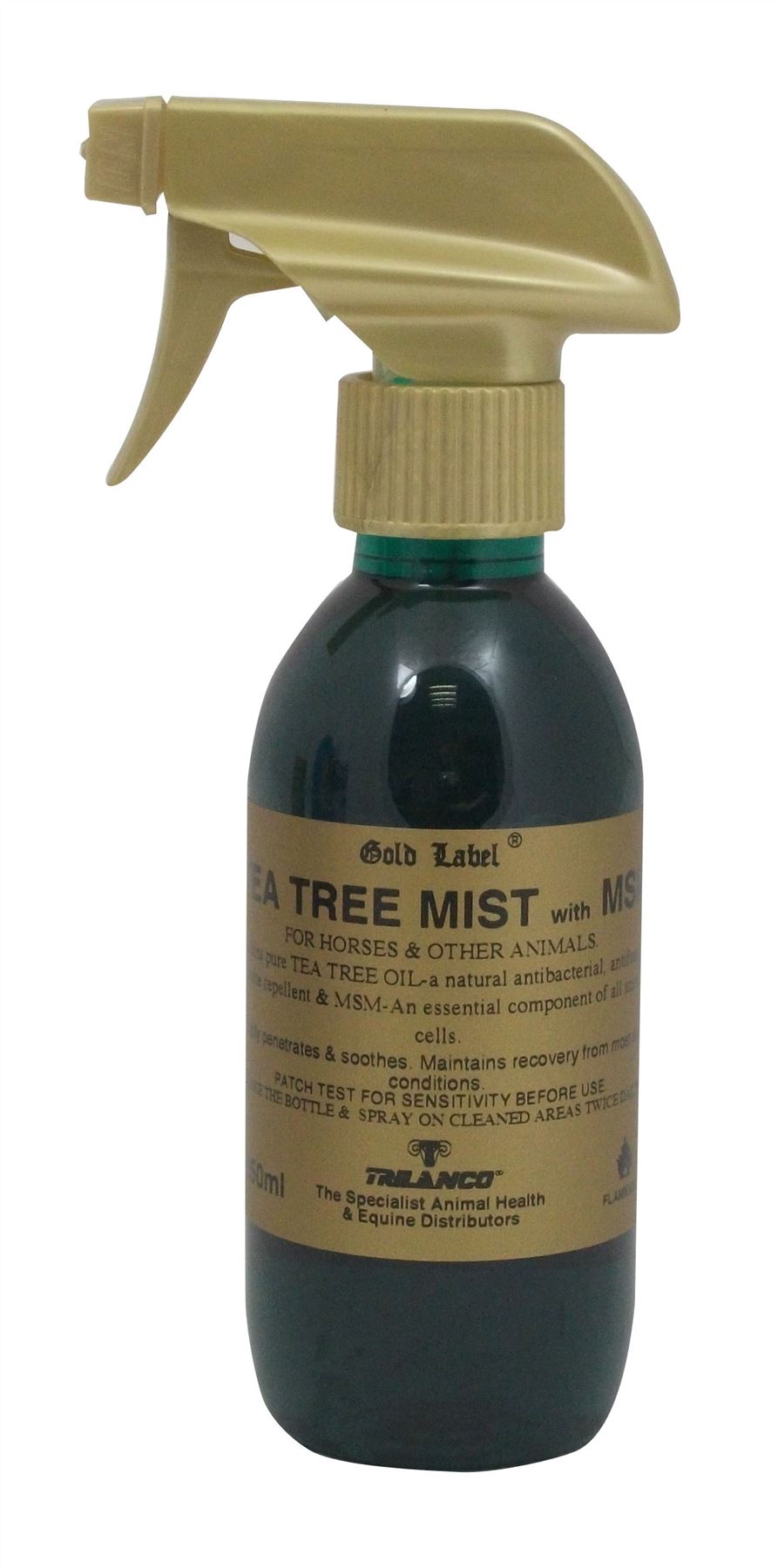 Shop now at Just Horse Riders for the Gold Label Tea Tree Mist With MSM. This product is an antibacterial and anti-fungal solution, expertly formulated with tea tree oil and an additional dose of MSM. MSM is known to enhance the healing process, making this product effective against a wide range of skin conditions. Just Horse Riders is your trusted source for high-quality equestrian products. Benefit from our quick dispatch and delivery, and superior customer service. If you have any questions about the Gold Label Tea Tree Mist With MSM, don't hesitate to contact us.