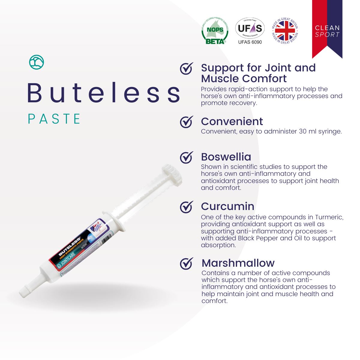 Intense training and competition programmes can place considerable stresses on joints and muscles, especially at longer shows and events. Buteless High Strength Paste provides rapid-action support to help the horse's own anti-inflammatory processes and promote recovery after intense exercise, especially on hard ground.