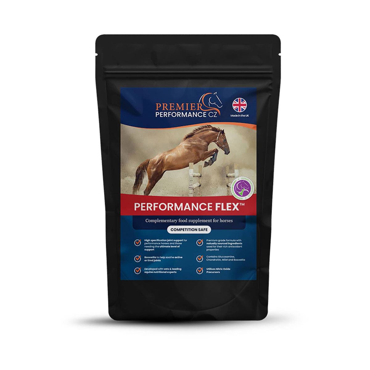 Performance Flex helps mobility, supporting joint structure in horses of all ages. This new and improved formula is offering a higher and more powerful formula combining high quality joint focused ingredients. A scientifically balanced ratio of Glucosamine, Boswellia and Chondroitin, the highest quality MSM plus the added benefits of a powerful anti-oxidants, designed to address excess free radical build up around the joints. Providing even more support, encouraging maximum joint health, lubrication to the joints and muscle recovery. Effective nutrient supplement designed to reduce aches and soreness. It is an easy to give powder that you add to your horse�s daily feed.