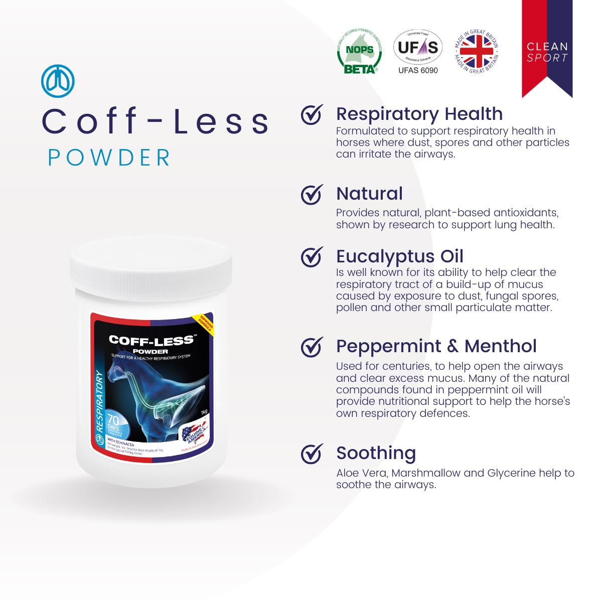 Targeted nutritional support can help support the horse�s natural defences against such challenges, and Coff-Less Powder contains a powerful blend of natural herbs and phytochemicals (active compounds from plants), known for their role in maintaining respiratory function.
