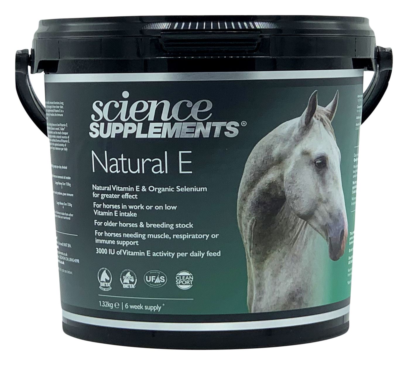Shop now for the Science Supplements Natural E at Just Horse Riders. This supplement is ideal for horses that are in work, on a low vitamin E intake, or those that are older or part of the breeding stock. It's also perfect for horses that require muscle, respiratory, or immune support. This supplement provides a natural source of vitamin E, coupled with organic selenium, which is essential for the optimal activity of vitamin E.