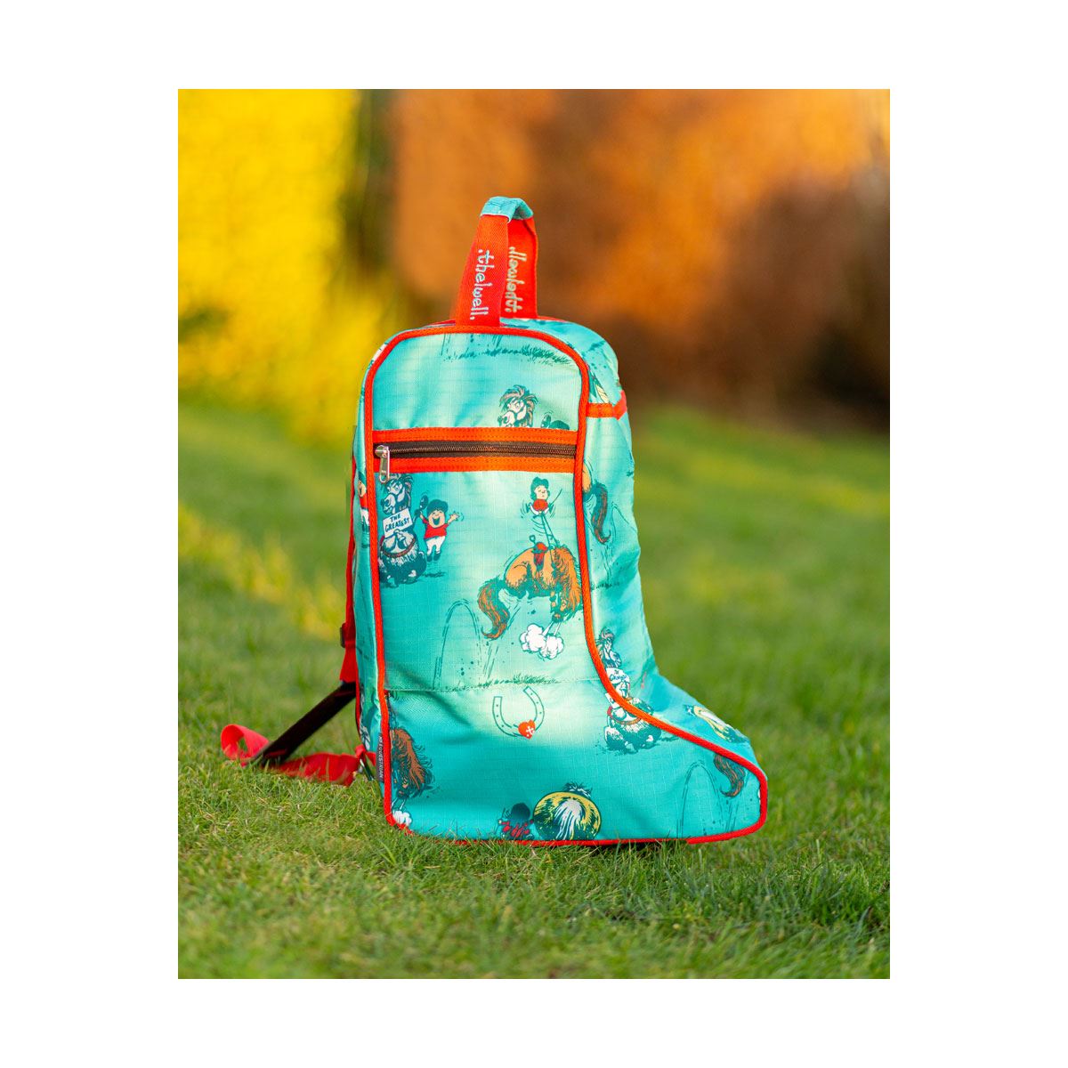 Transport and store boots in style with this fun, bold boot bag. This funky bag is covered in classic Thelwell characters and is made with a waterproof nylon outer and secured with a duo zip fastening to keep boots dry and clean. Also features a zip side pocket, grab handle and over the shoulder carry strap