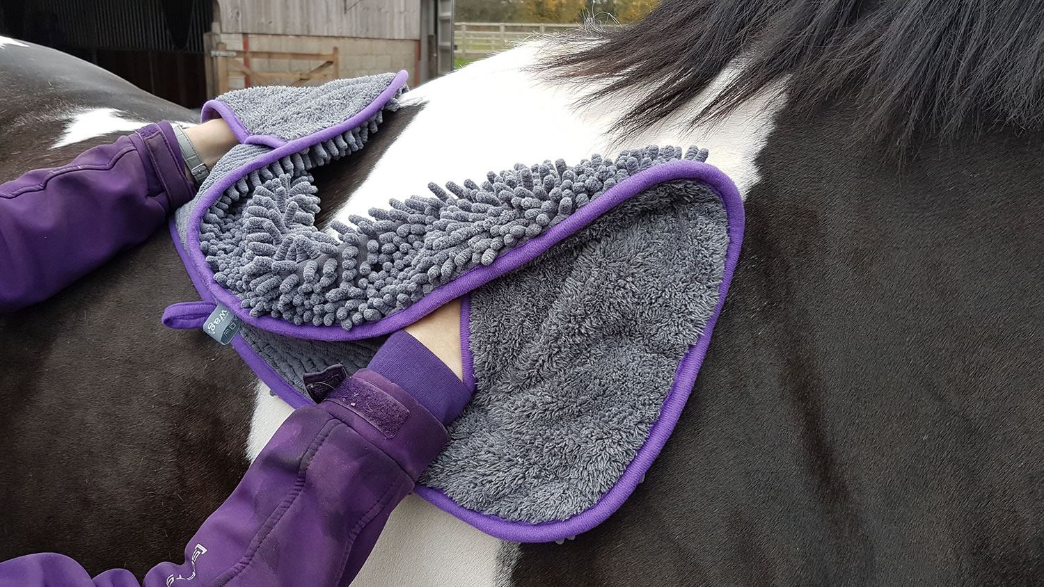 Shop now at Just Horse Riders for the Henry Wag Equine Microfibre Glove Towel, the perfect solution for keeping your horse clean and dry. This high-quality towel is specifically designed to effectively remove water, mud, and dirt from your horse's coat, head, and legs. Thanks to the super absorbent microfibre material, it can absorb more water and dry faster than traditional towels.